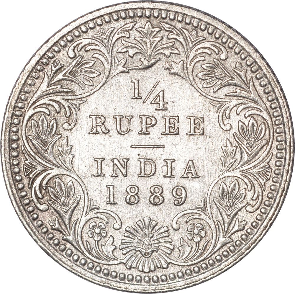 Silver Quarter Rupee Coin of Victoria Empress of Calcutta Mint of 1889.