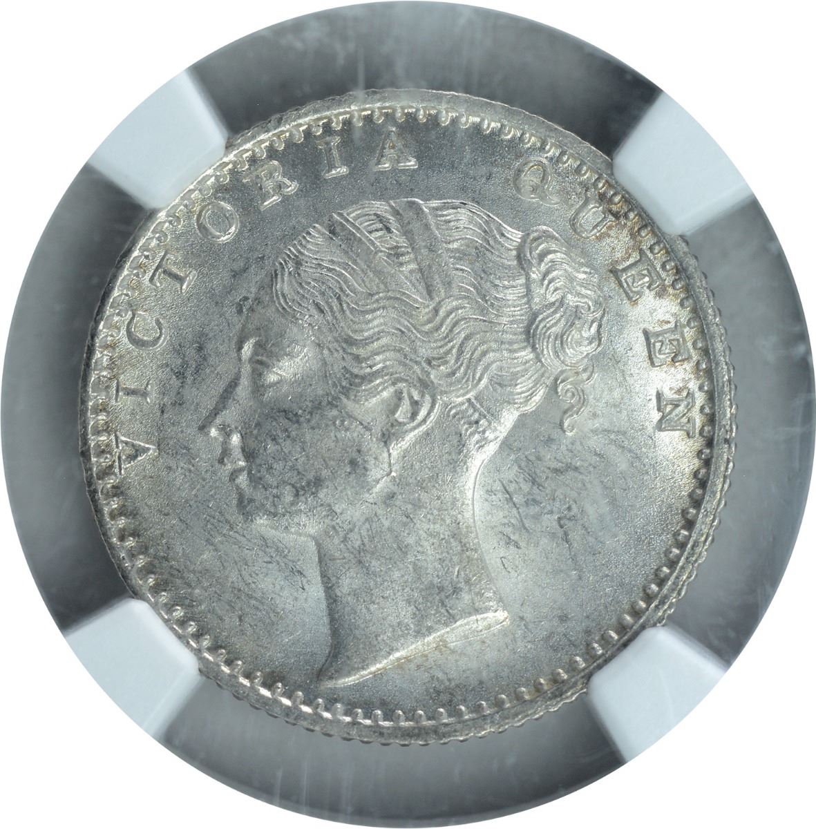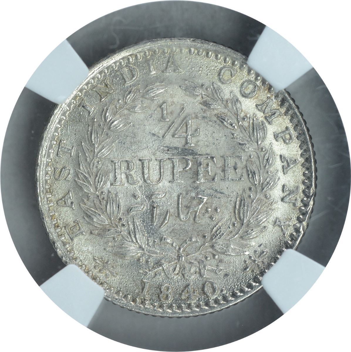 1840, Victoria Queen, Silver 1/4 Rupee, Continuous legend, Calcutta Mint, 34 berries (19L + 15R), A/4, (SW - 2.43), (PR # 103), graded slabbed by NGC as MS 62.