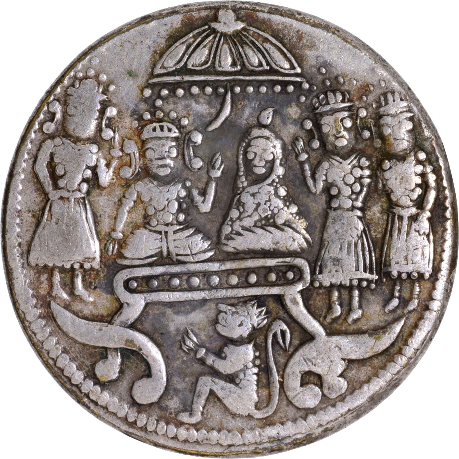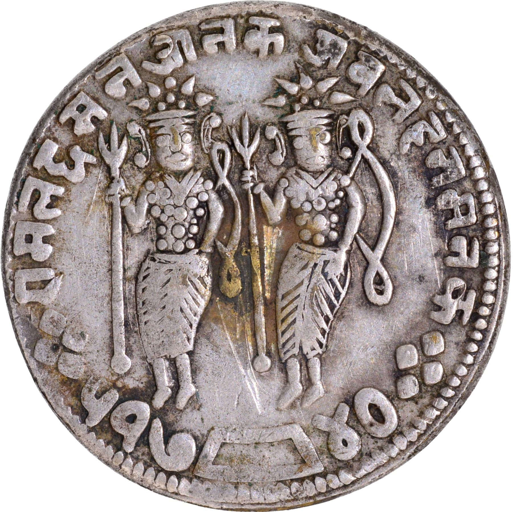 Ram Darbar Token(Mid 19Century CE),Silver Ramtanka, Obv:Durbar scene, Rama and Sita seated on durbar platform, attendant standing on the left holds parasol above them, Kusha and Lava, the two sons of Rama Sita standing on the right, Hanuman sit beneath the platform,Rev:Rama standing on left holding and Lakshmana standing on the right, both holding a trident and bow, Nagari legend and date around,15.83g, 29.56mm,(Mitch. Indian Tokens # 353),about very fine.
