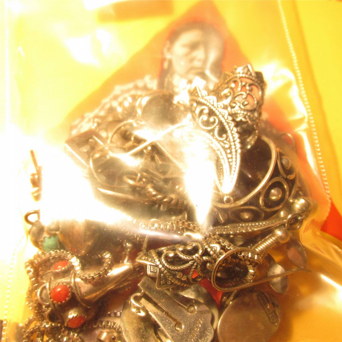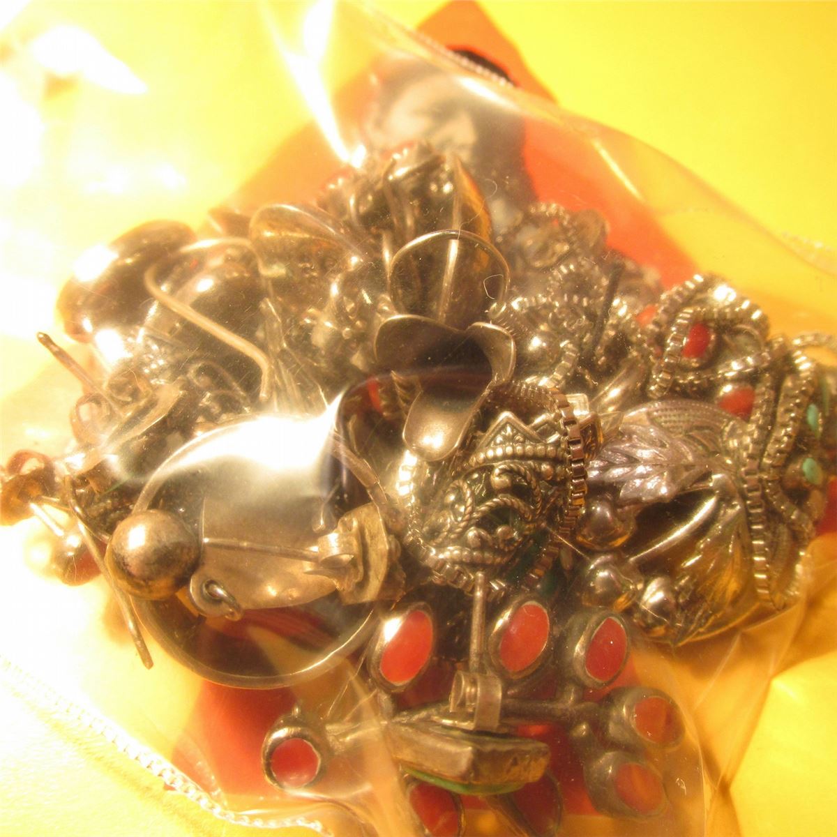 Silver Ring and a group of odd-lot Silver Earrings. Some with onyx, some coral, others Turquoise.