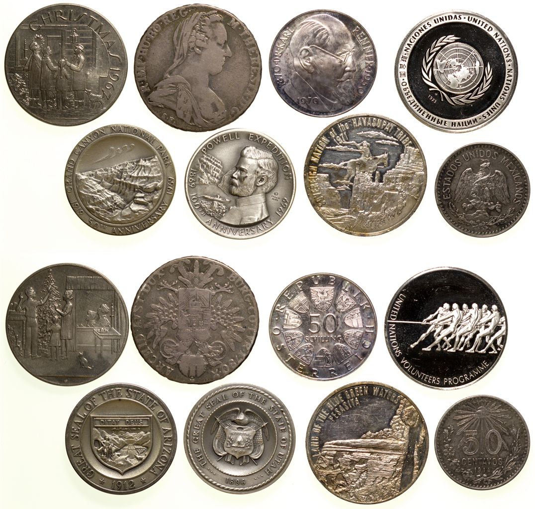 Lot of 8: 1) 1871 Sovereign Nation Havasupai Tribe, BU; 2) United Nations Volunteers Programme, BU; 3) Christmas 1967, BU; 4) Maria Therestad 1780, VG; 5) Dr. Karl Renner, 1970, Austria 50 shilling, BU; 6) 1914 Mexican 50 centavos, XF; 7) Medallic Art 999 pure silver Powell Expedition 100th Anniversary 1969, AU; 8) Medallic Art 999 pure silver Grand Canyon Park 50th anniversary, 1969, AU. -59623