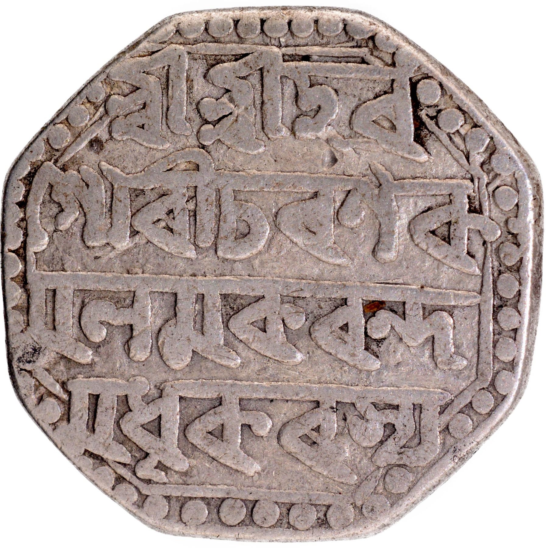 Assam Kingdom, Gaurinatha Simha or Siu-hit-pang-pha(SE 1702-1718 /1780-1794AD), Silver Rupee, Saka Era 1716, Obv: Assamese legend Sri Sri hara /Gauri charana ka /mala makaranda /madhukarasya, Rev: Assamese legend Sri Srimatsva /rga deva Sri Gau /rinathasya /saka 1716 below lion facing to left, 10.79g, 23.65mm, (KM # 218 /RB# R 52.1), about very fine, Scarce.