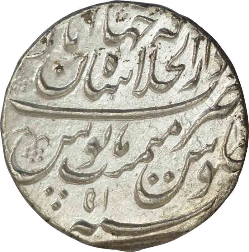 Aurangzeb Alamgir,Shahjahanabad Dar ul Khilafat,Silver Rupee,AH 1118/51 RY,Obv:"badr munir"couplet,Rev:sana