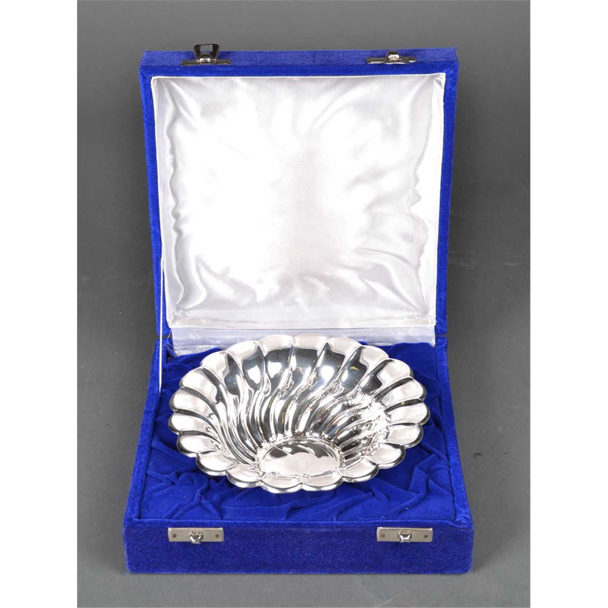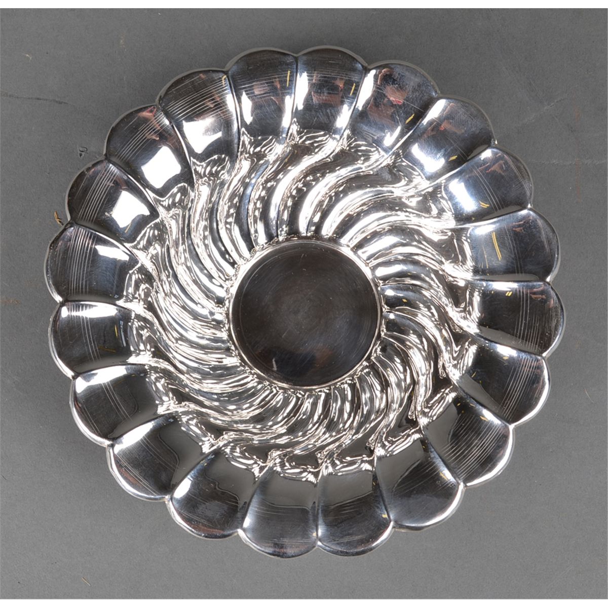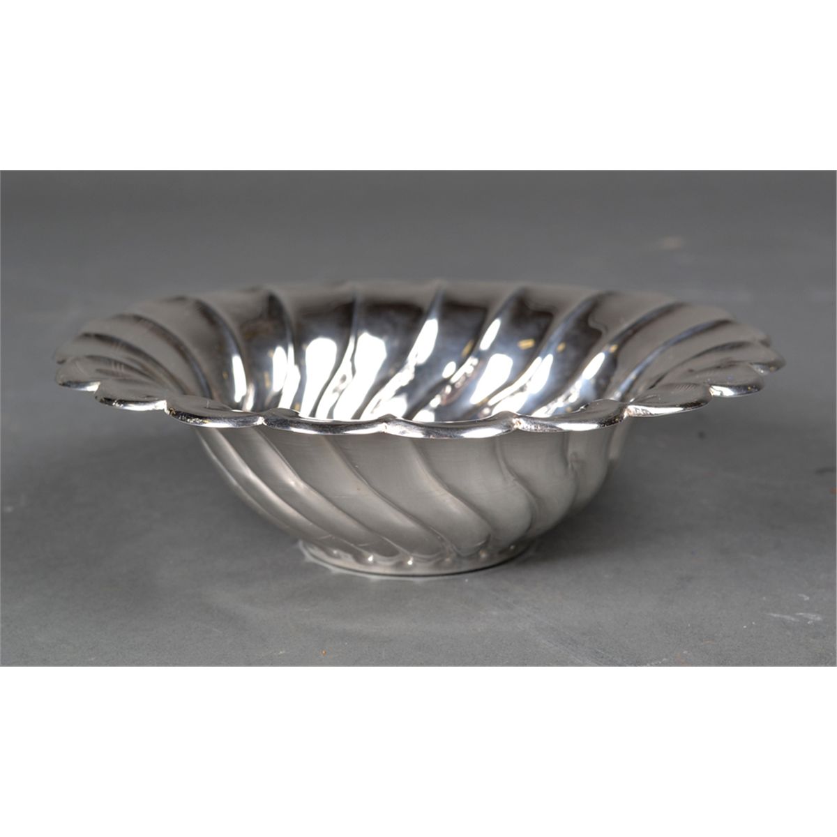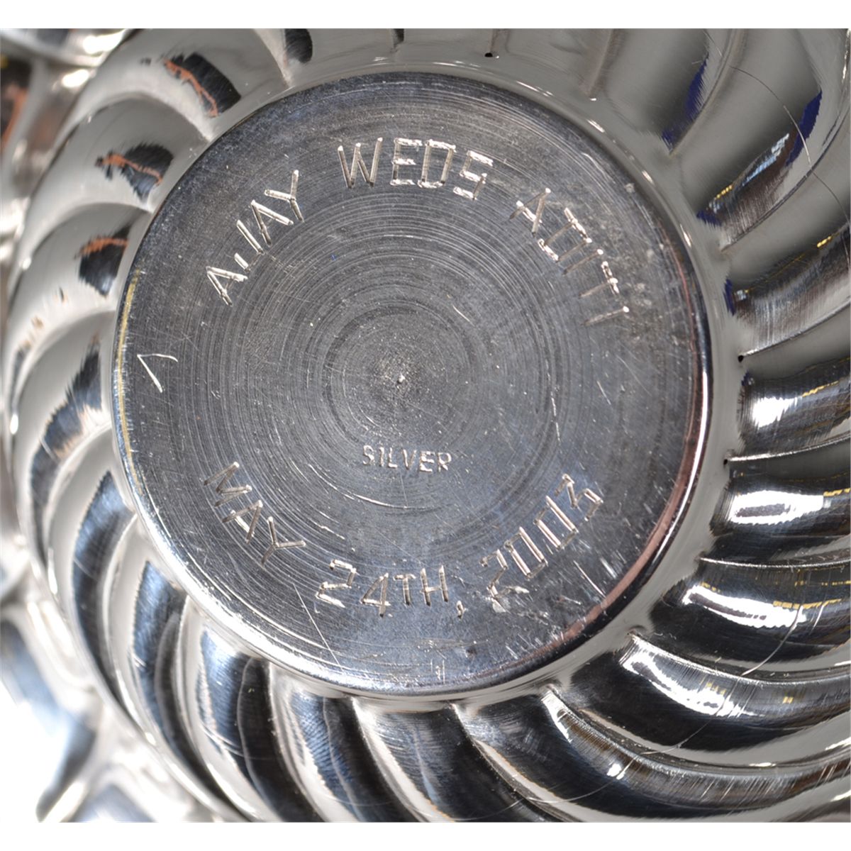Deep open bowl with scalloped design, tested Sterling, marked Silver. Monogramed on bottom Ajay weds Aditi May 24, 2003. In fitted silk and velour box. 2 " H x 6.5" Dia. 91 grams TW. Circa 21st century. Private collection St. Clair, MI.