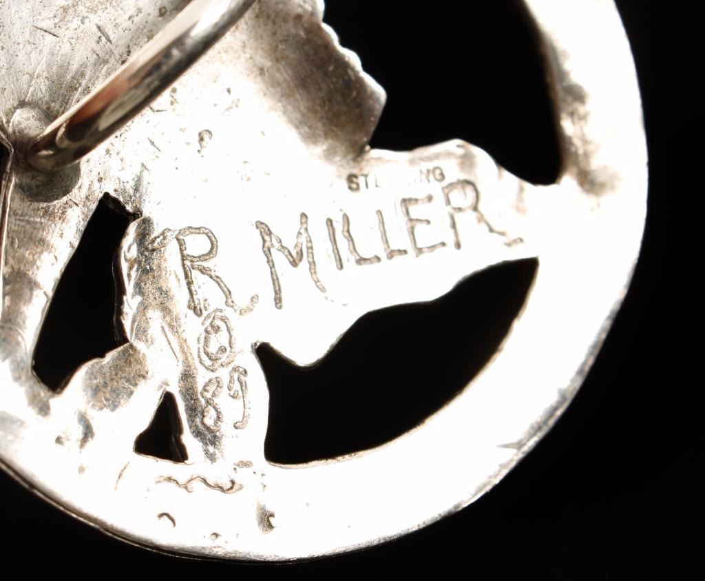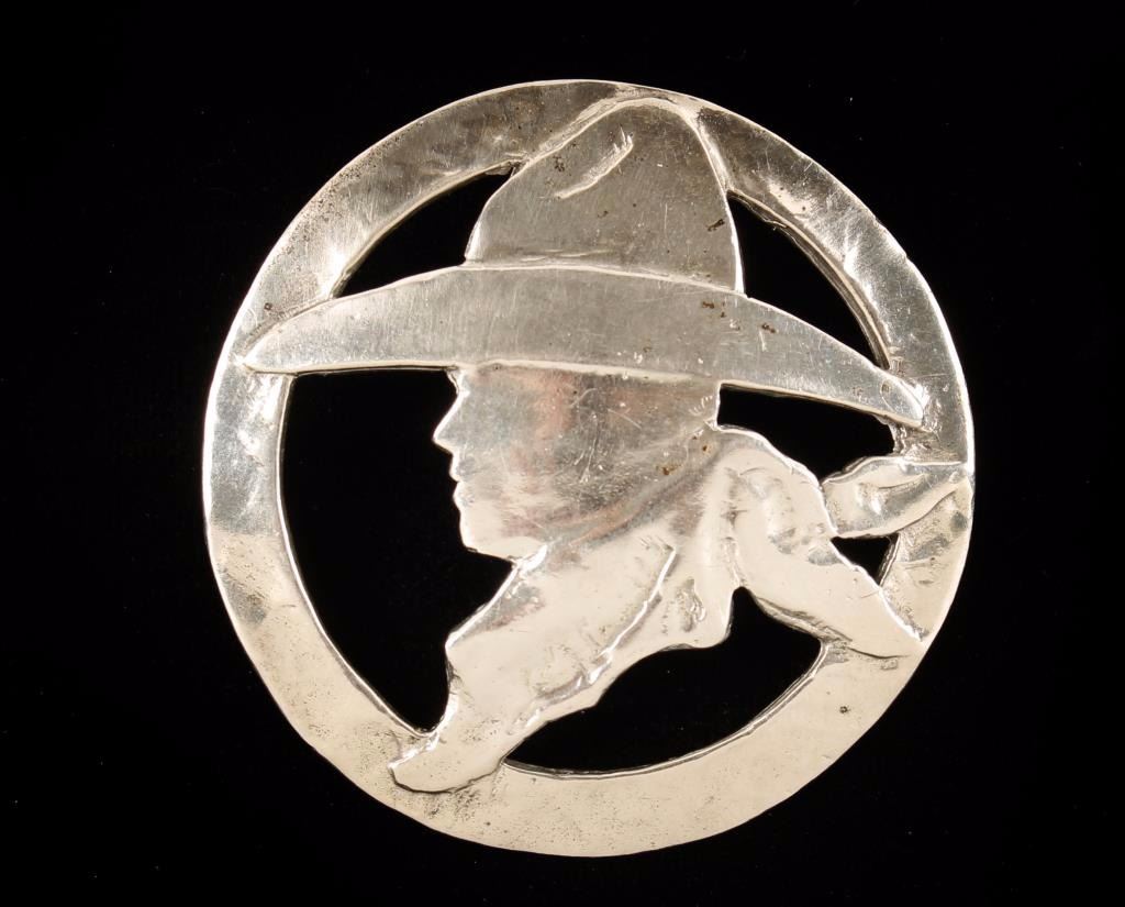 Openwork pin of circle with a cowboy profile in the center. Signed 'R. Miller 89' on back.