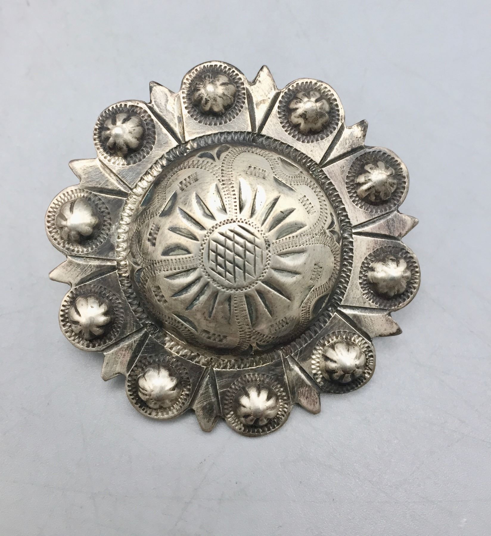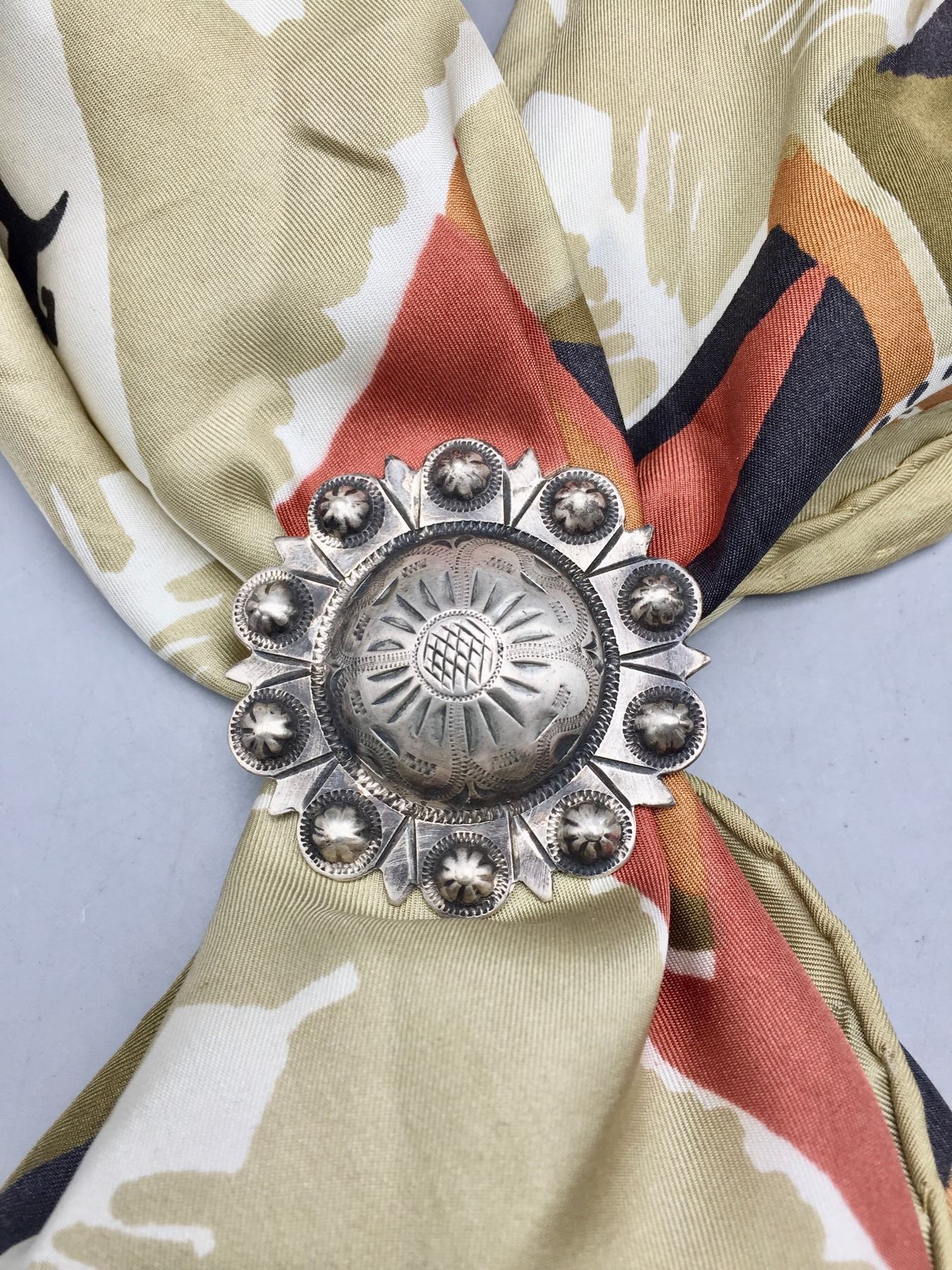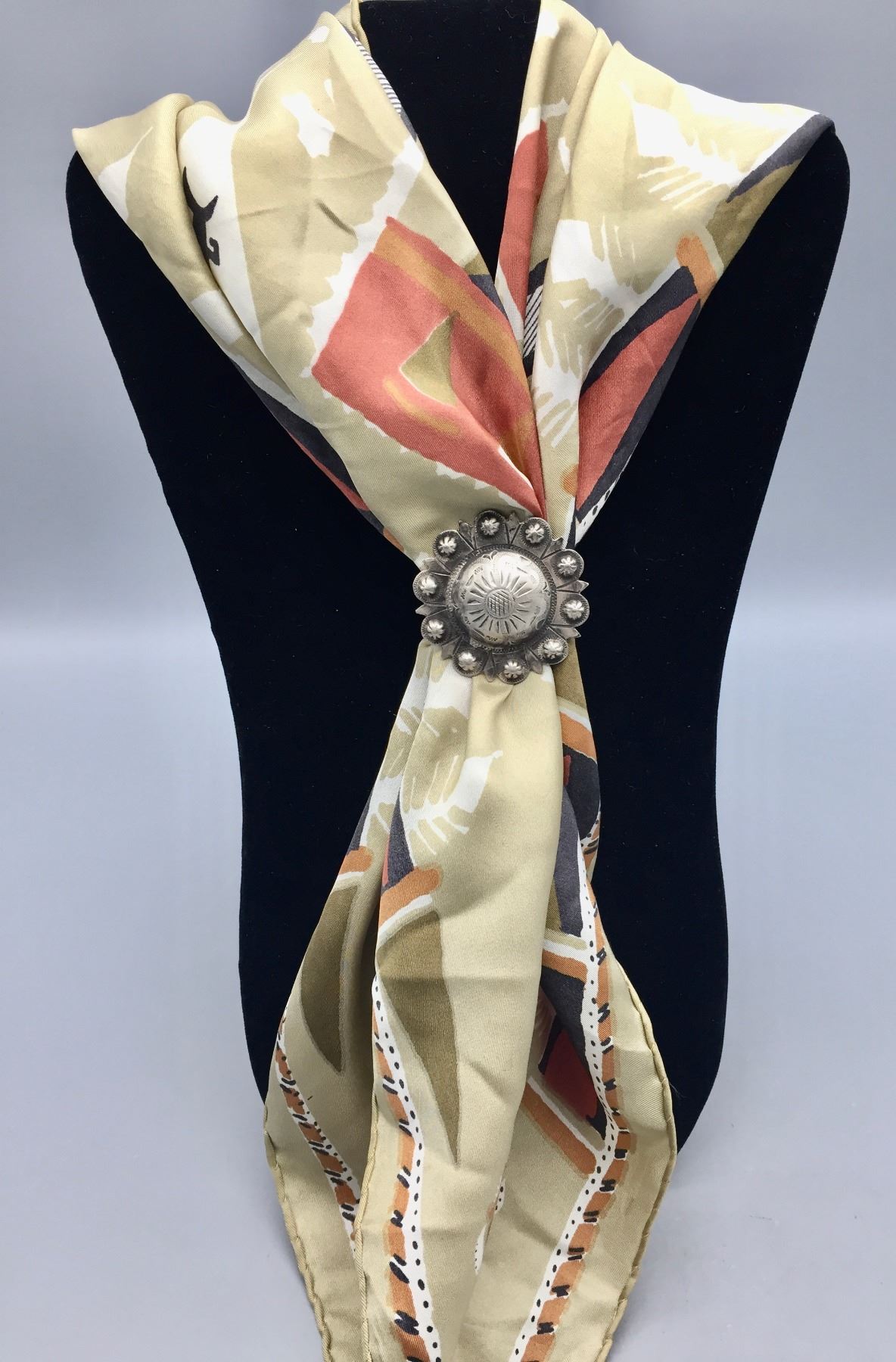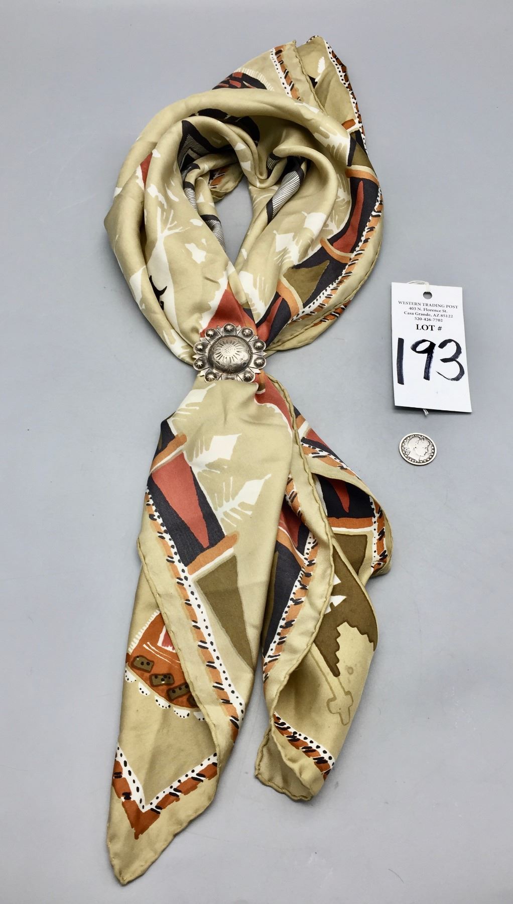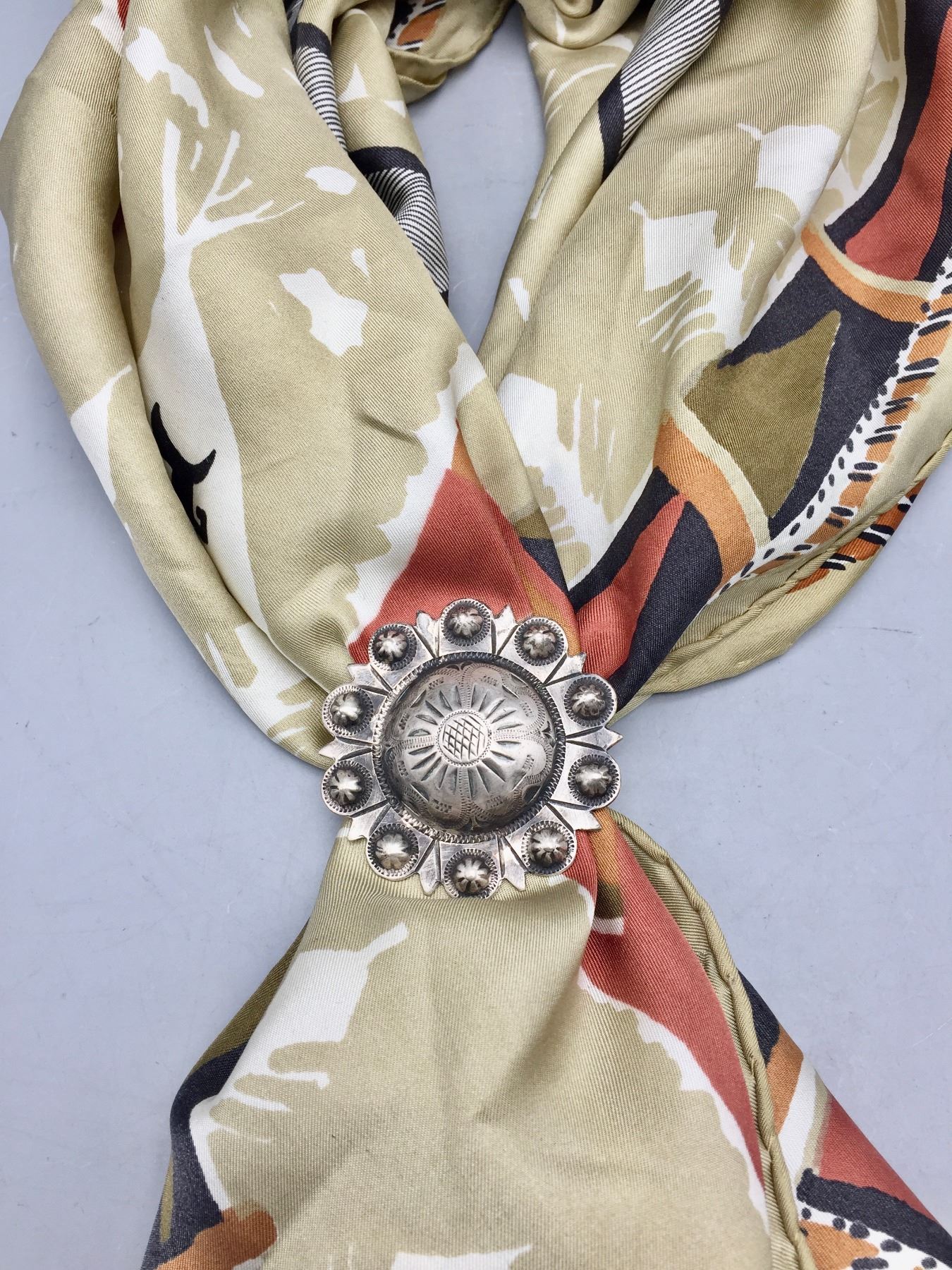 Description: Available for sale in this lot is a beautiful silk scarf with a sterling silver slide featuring hand crafted silver work.