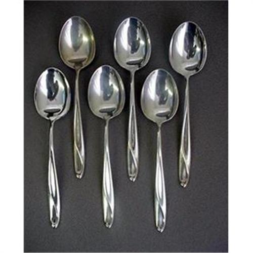 These are 6 Reed & Barton Silver Sculpture place soup spoons. This silver has never been used. We welcome inquiries.