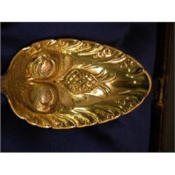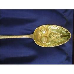 Silver spoonset for serving berries. Repousse fruit design on spoon bowls. London, circa 1817-1823. Four spoons 9" in diameter, one ladle 7" in diameter and 1" deep. Good Condition, slightly tarnished.