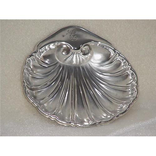 Revere Silver Co, Brooklyn, NY is the maker of this sterling silver shell, 3 1/4' in diameter. A pretty little dish to hold sweets, jewelry, etc. Engraved with the letter E.