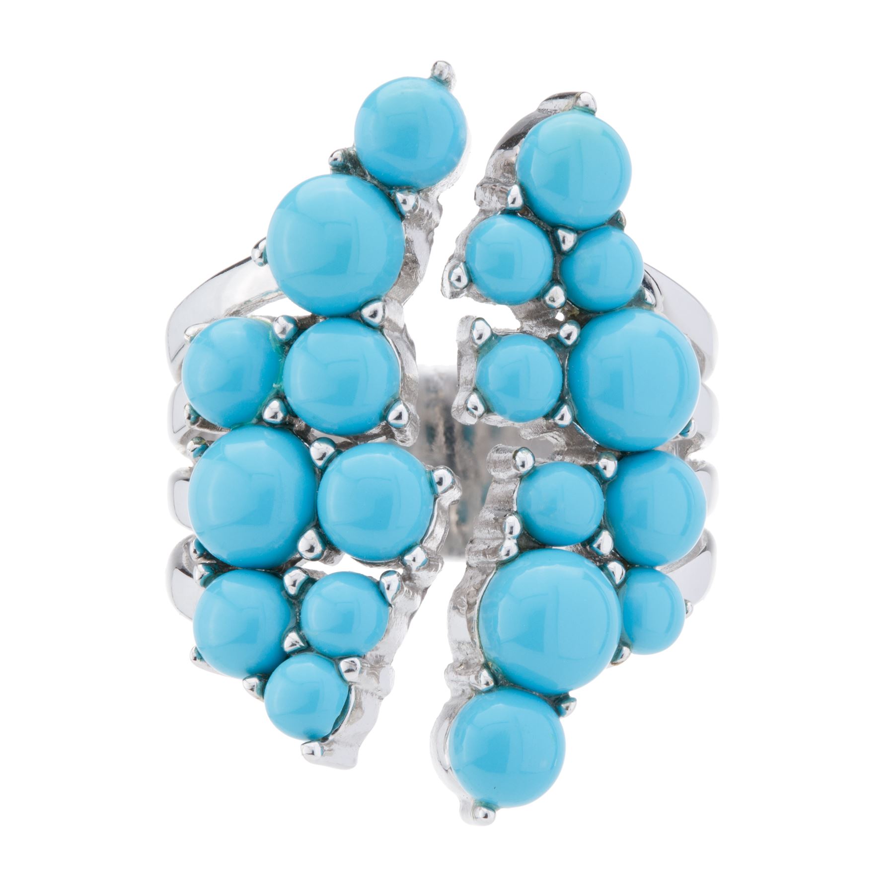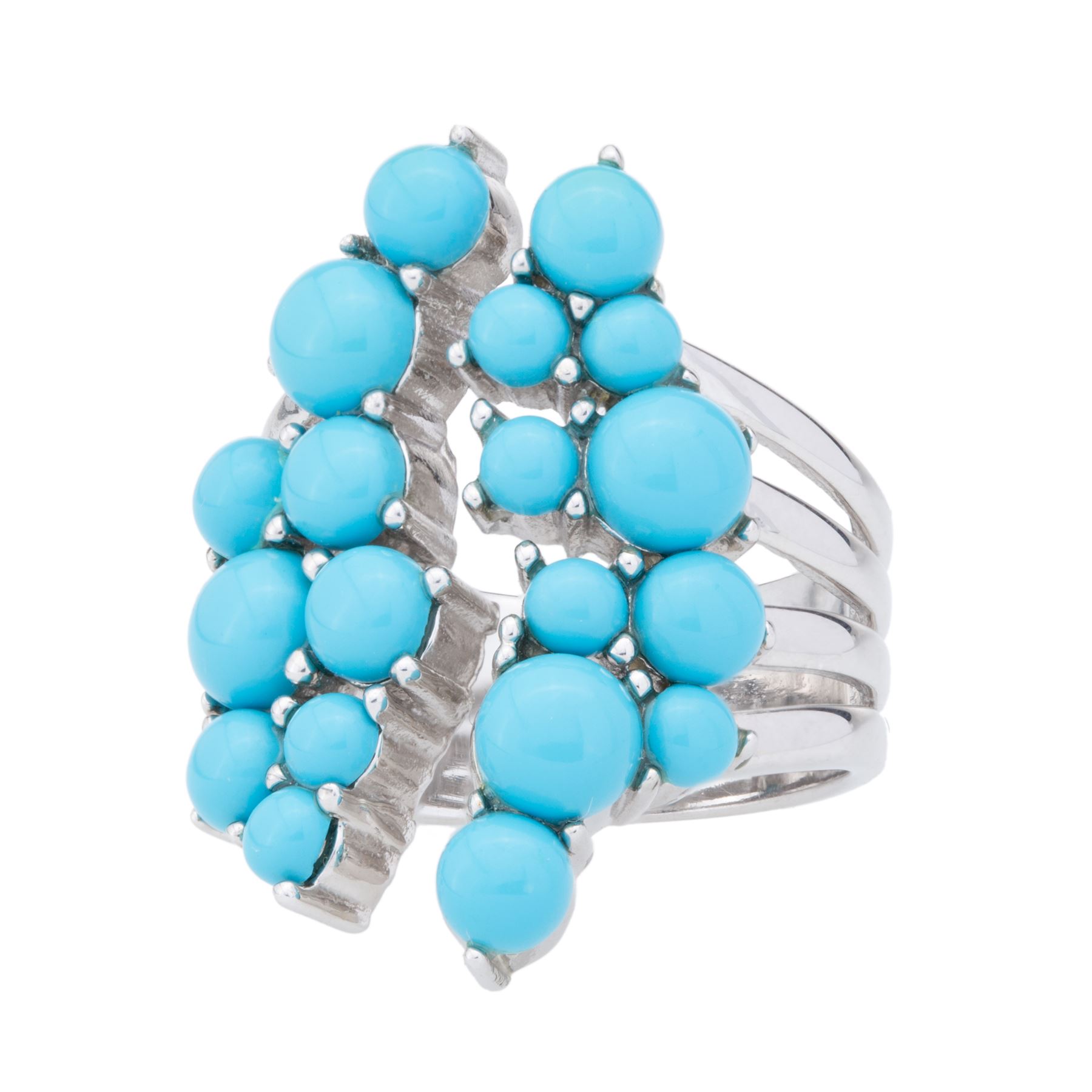 Finely crafted in 925 Sterling silver with Brilliant blue Turquoise cabochons artfully bubble up on the top of the ring on either side. A deep crevice similar to a desert canyon splits the bubbles apart. When you think of bubbles, what do you imagine? Light, airy, fun. Right on. That's this ring to a tee. • Genuine Sonora Beauty Turquoise