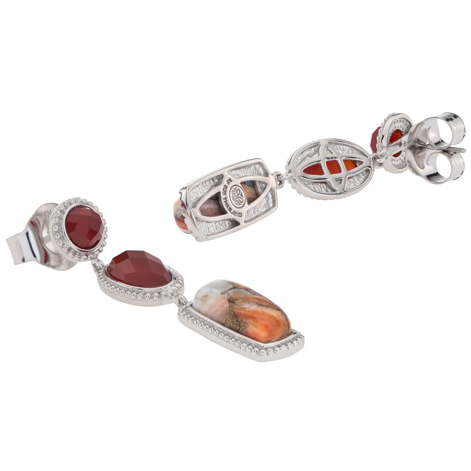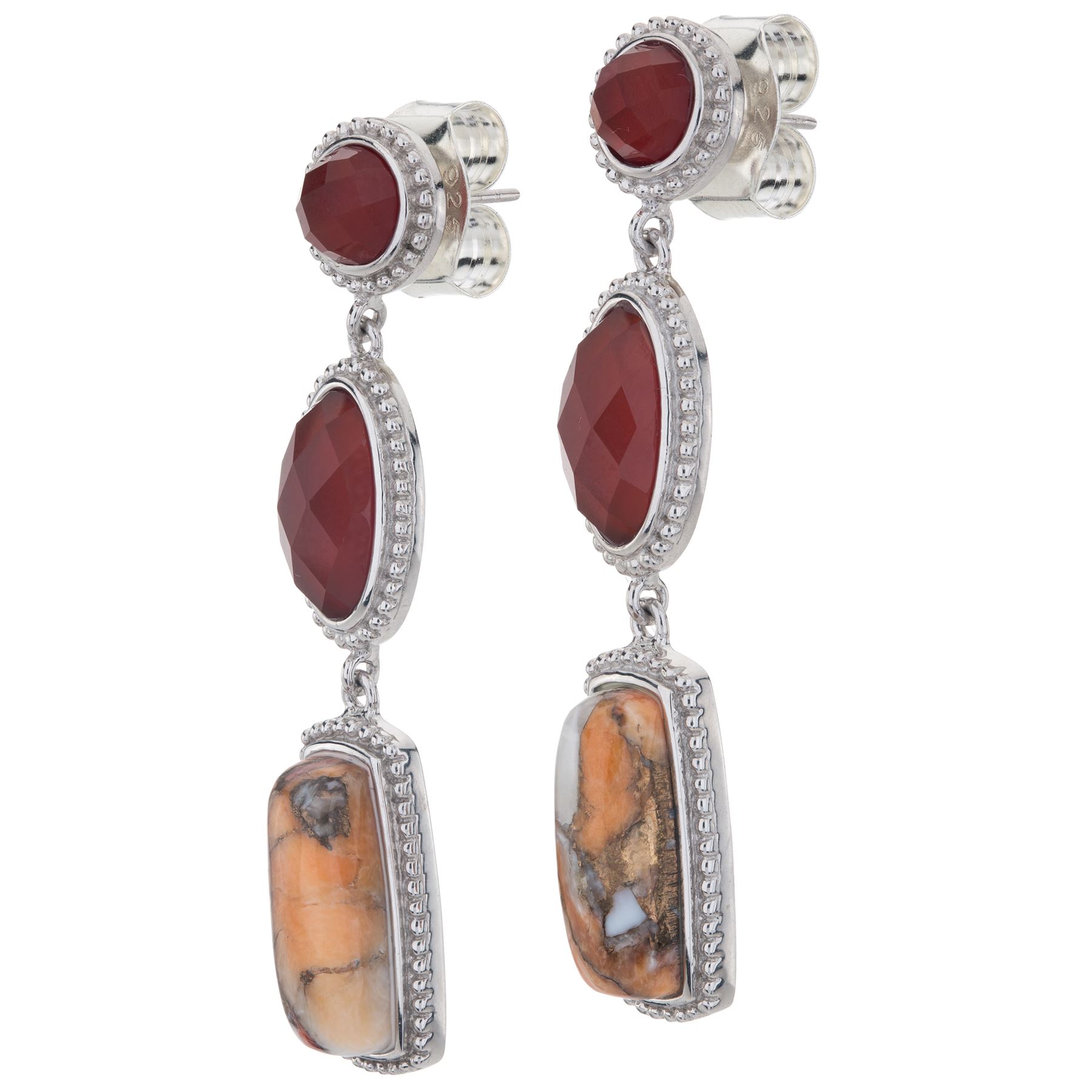 Pangea Mines beautifully juxtaposes shapes, colors and textures to create a truly striking drop earrings. Beautifully crafted in gleaming rhodium over sterling silver, with genuine cushion cut spiny oyster bronze, oval cut red agate, and round cut orange chalcedony, this distinctive design will certainly brighten your day. Convenient butterfly backs complete the look.