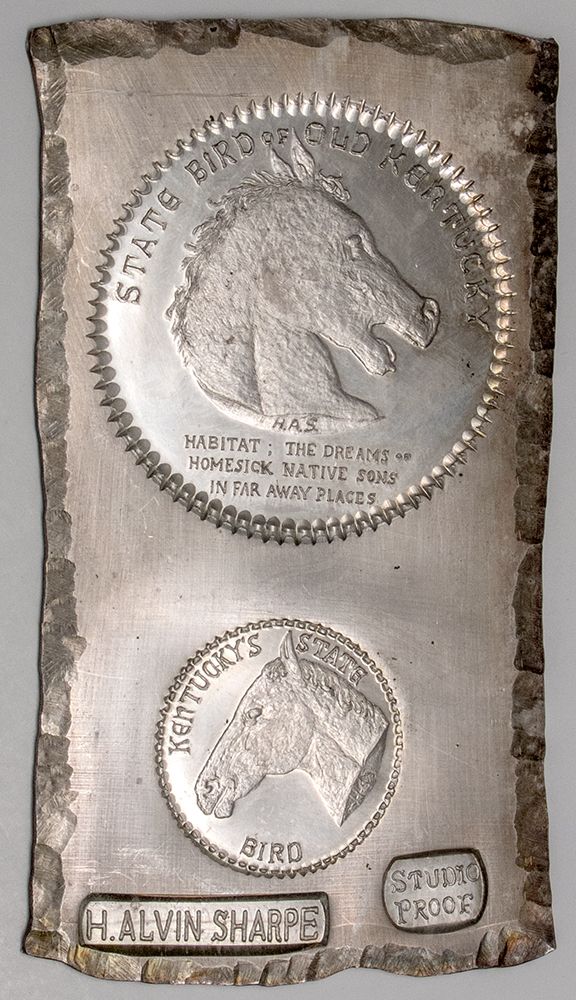 A marked studio proof of two Kentucky medallions from H. Alvin Sharpe (1910-1982—see his story in this catalog for the Gold and Ruby Pendant), who was a master of intaglio, the art of inscribing upon metal. This silver slab measures approximately 2 x 4” and contains two medallion samples: 1) “State Bird of Old Kentucky (showing the head of a neighing horse) / Habitat: the Dreams of Homesick Sons in Far Away Places” (42 mm diameter); and 2) “Kentucky’s State Bird” (showing a horse head), (24 mm). - HKA#65663