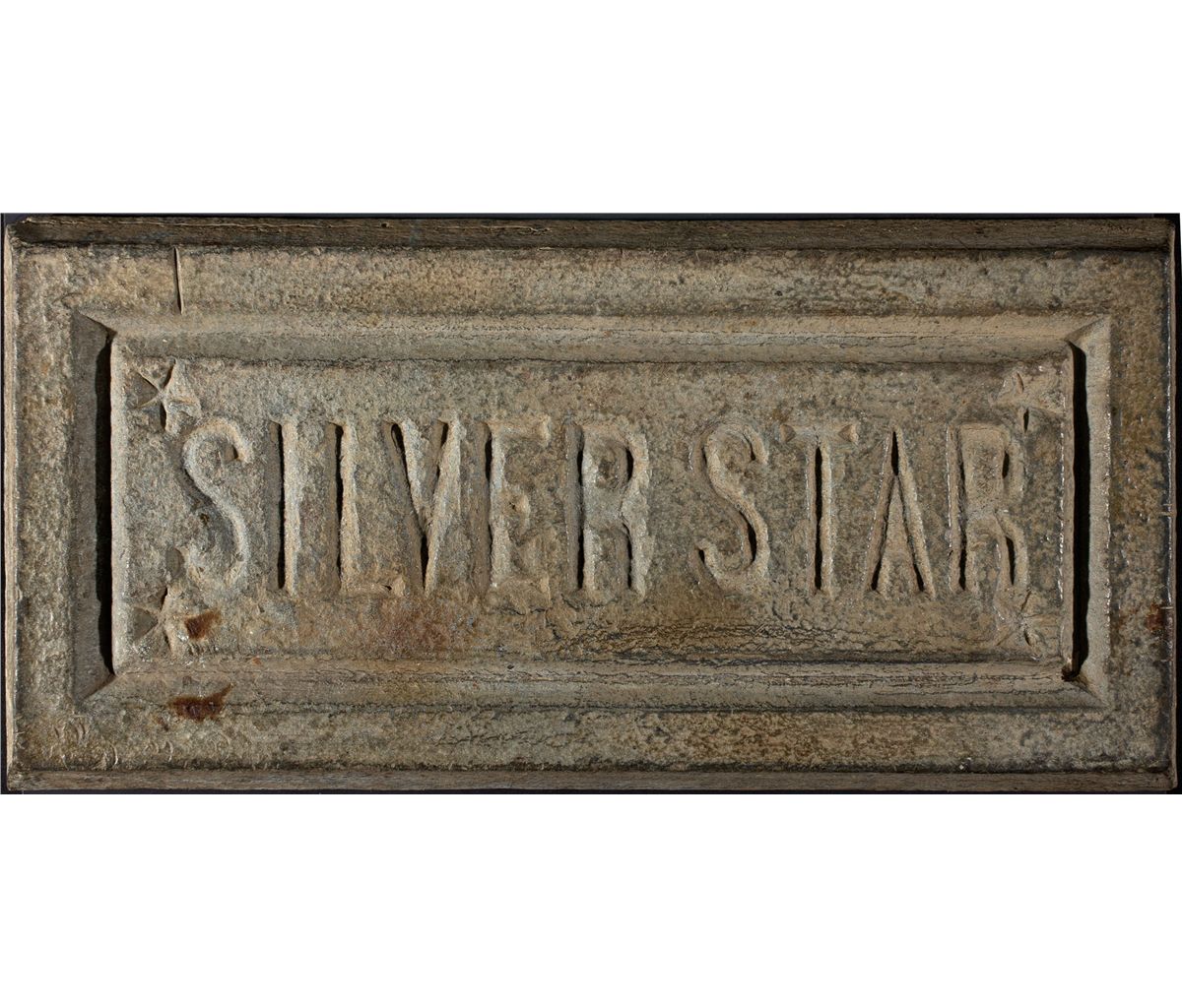 Debossed “Silver Star” with a star at each corner of the front nameplate, 8.5" x 18" x1.25.” On the back is shipping information in black paint, barely readable “H. I. W. / G-1497/ Honolulu, HI.” This ingot was found in Sacramento. We were unable to find any information on the company. I believe the Silver Star is a name for a smelter. We analyzed cuttings from this ingot under an SEM/EDS at American Assay Labs in Sparks. The ingot is a low quality zinc ingot, with a texture that we think shows older and more crude metallurgical construction, with many impurities. There is no silver. Zinc historically was mined in New Jersey near Franklin, and produced by such companies as New Jersey Zinc. There were a number of zinc smelters in the region, and there are numerous Silver Star mining districts in the Western United States, including one in Idaho. The Silver Star Mine, located about 30 miles from Ketcham, ID had a smelter at Ketcham in the 1890s to handle their zinc, which ran as high as 17% in the ore [History of Idaho, Lewis Publishing Co., pg. 441]. This is the only record we could find of a smelter with the same name. There is also a Silver Star smelter in China, that may pre-date WWII. Zinc was also mined in the upper Mississippi Valley region along with lead--in fact, a young George Hearst lived within a mile of one of the main lead/zinc mines in Missouri in his childhood. I suspect the ingot is pre-1900 based on its appearance, construction, and internal texture, but we simply don’t know. Regardless, this is the best antiquarian zinc ingot we’ve ever had or seen in any museums. -60405