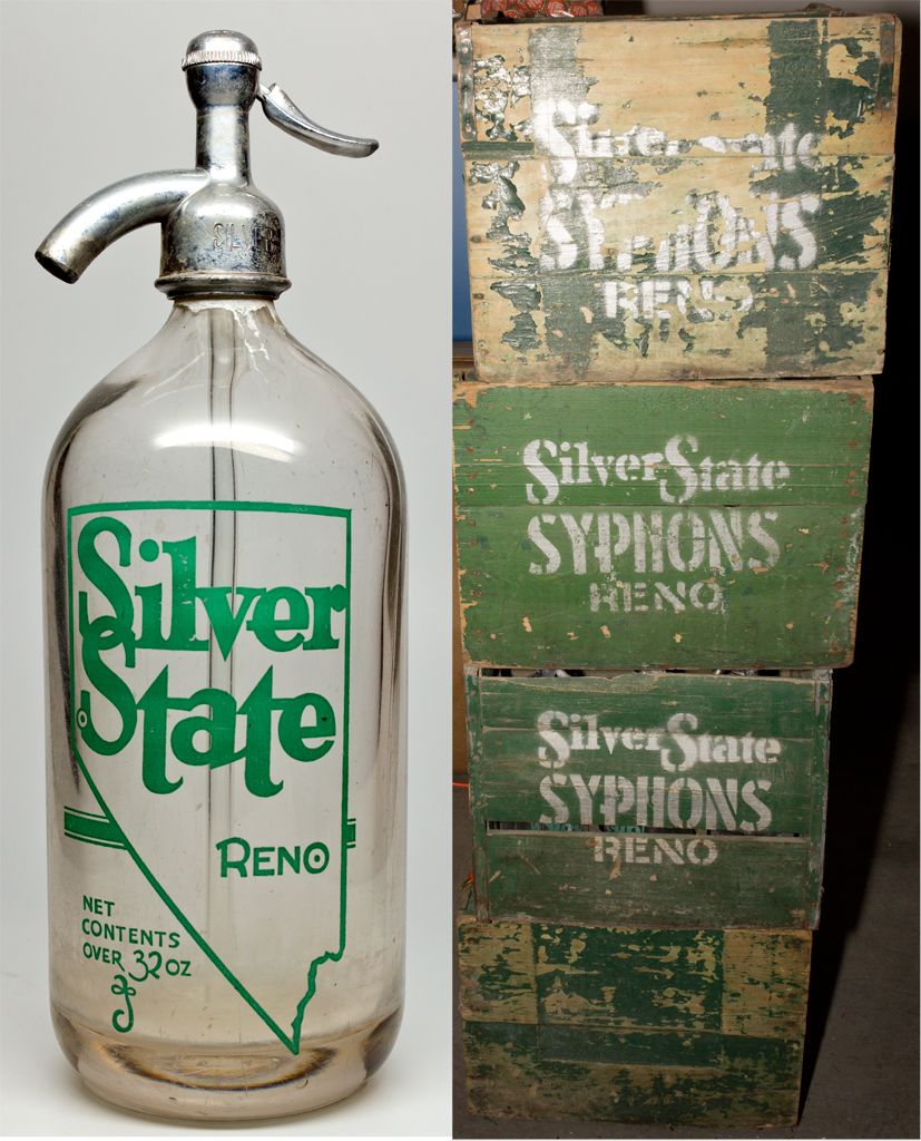 Lot of 8 crates (6 Silver State and 2 unmarked) of clear seltzer bottles. 34 of the seltzers bear the Silver State silk screened logo, and 5 are unmarked blanks. One of the crates has a rickety bottom. -60147