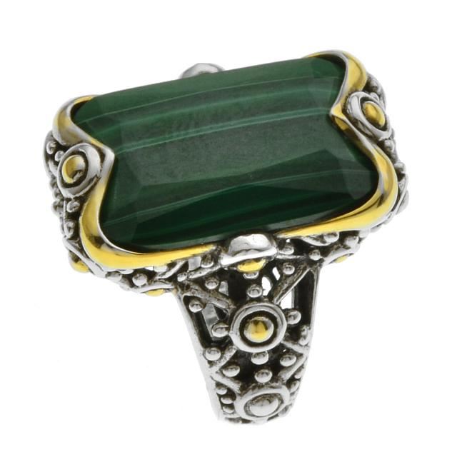 Bold and beautiful, Addison Lane’s Bali Grandeur ring makes a striking impression. Beautifully crafted in oxidized sterling silver and adorned with a dramatic rectangular cut malachite accented with 14k gold, this is a design certain to be noticed.