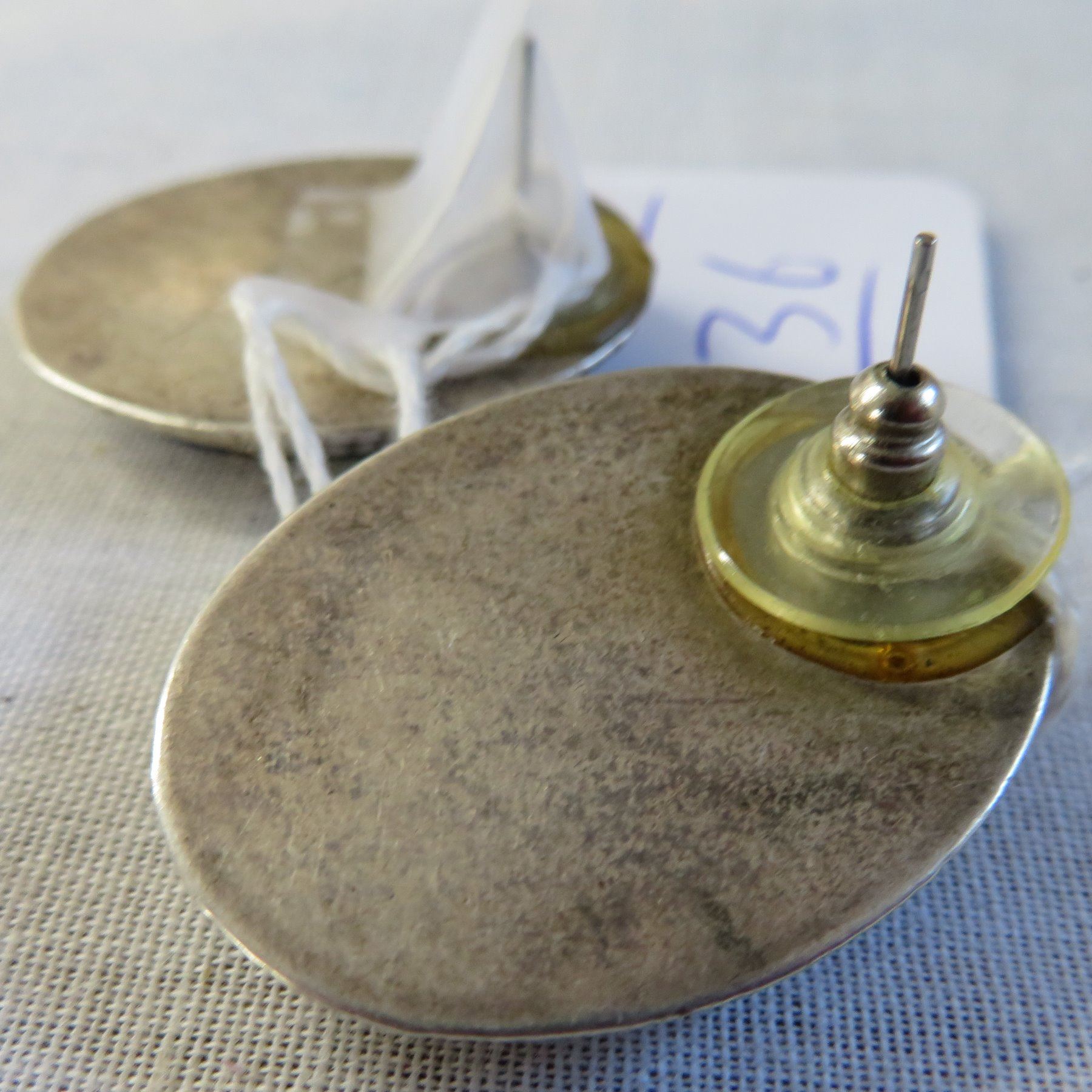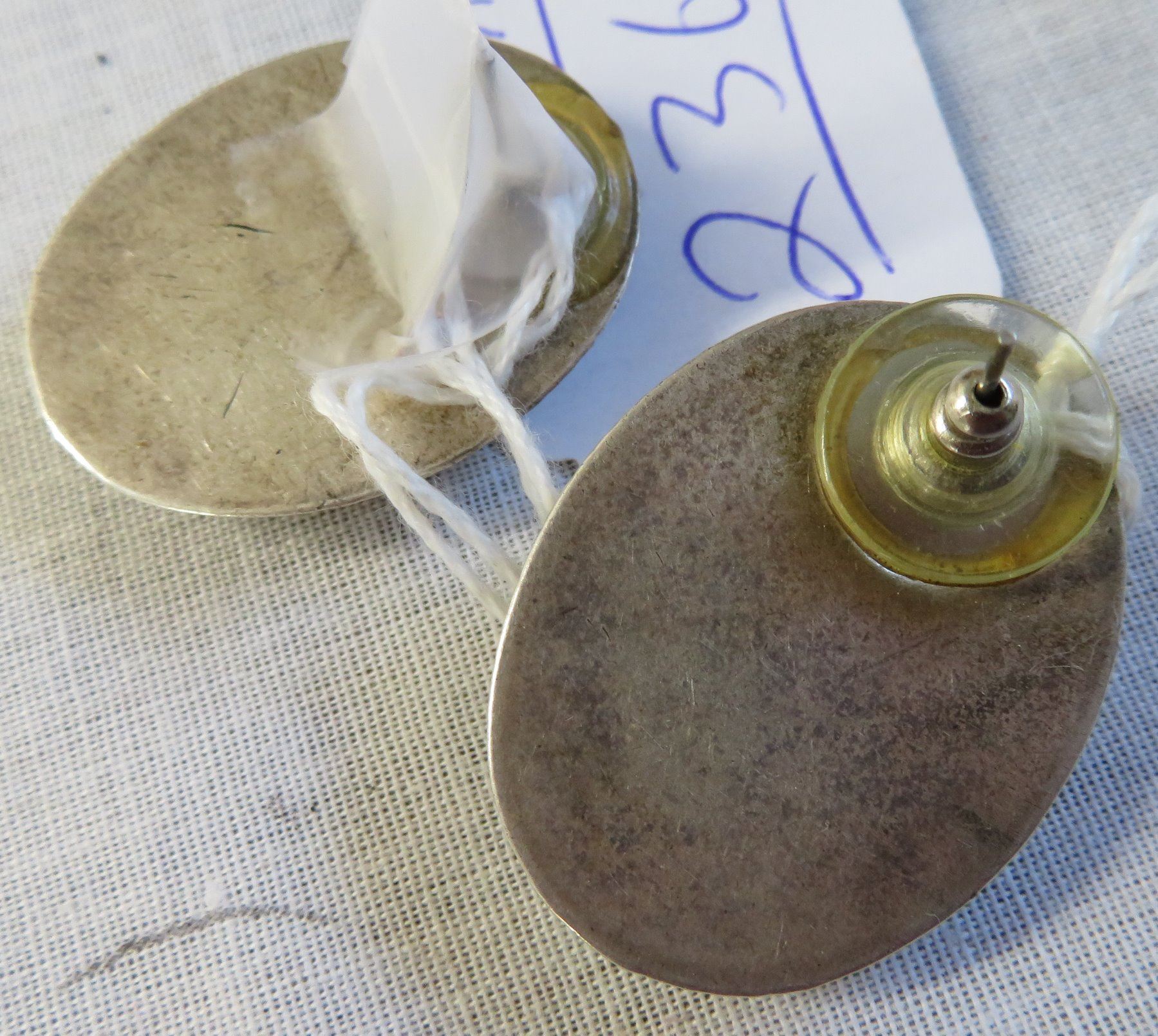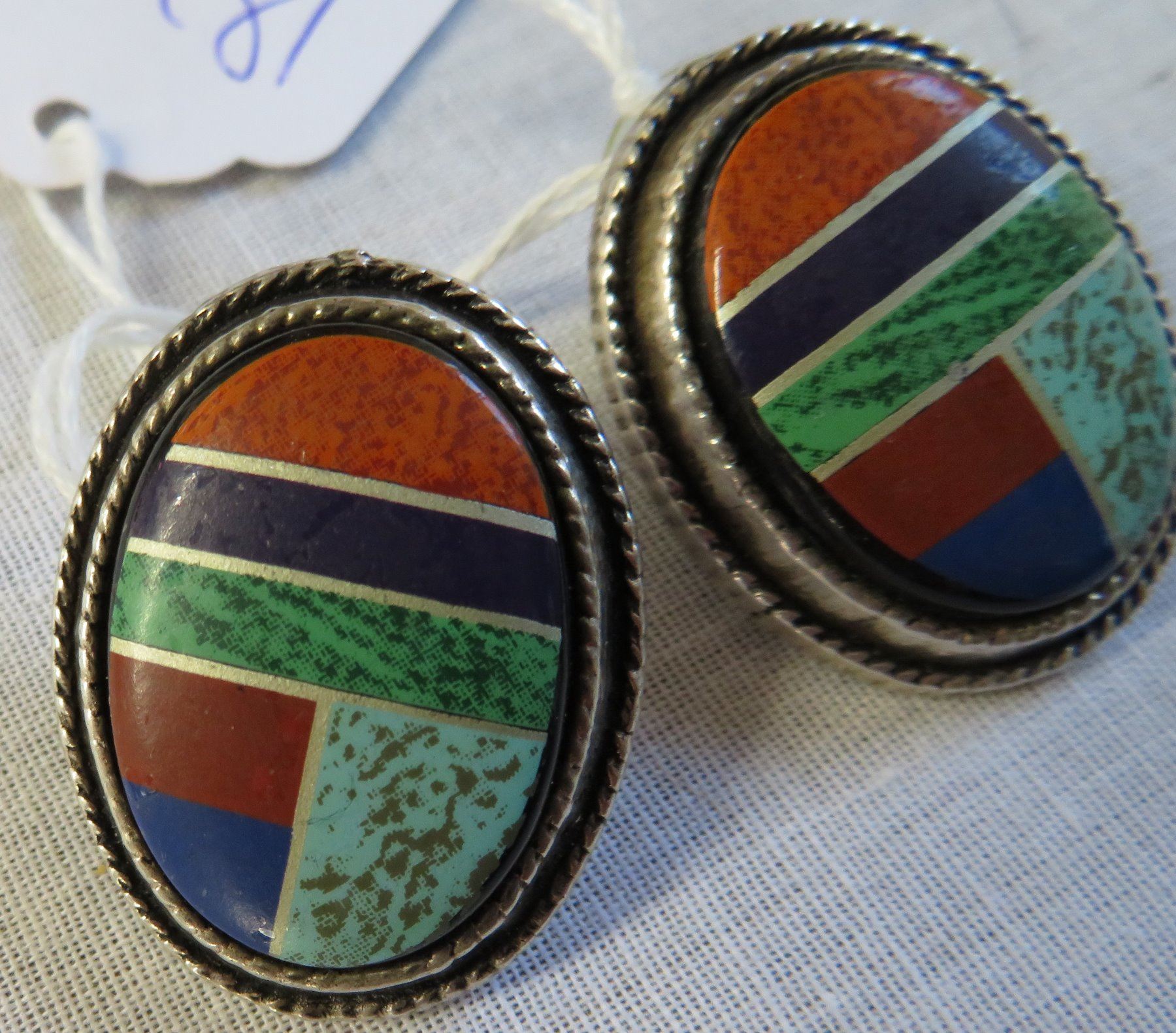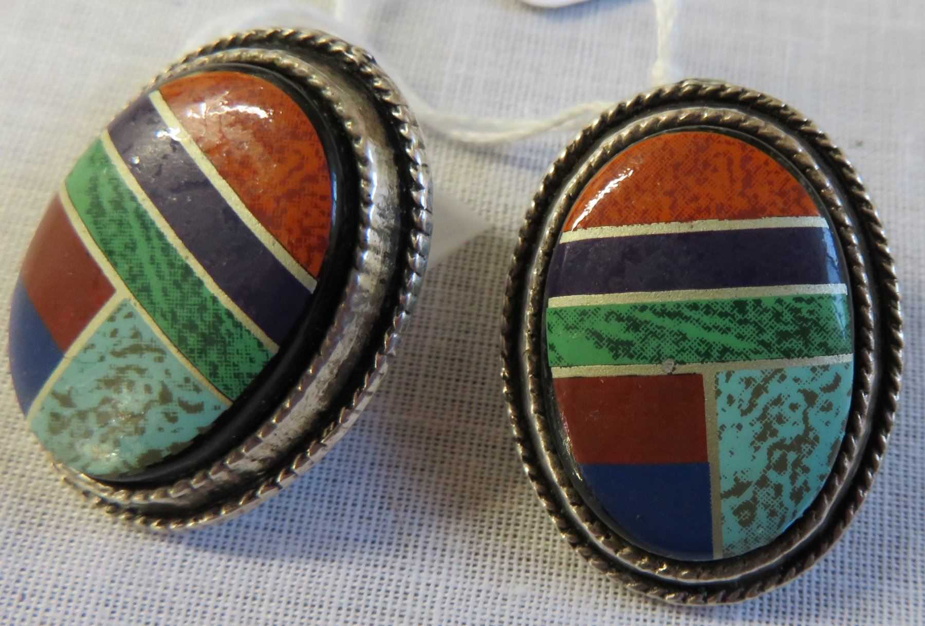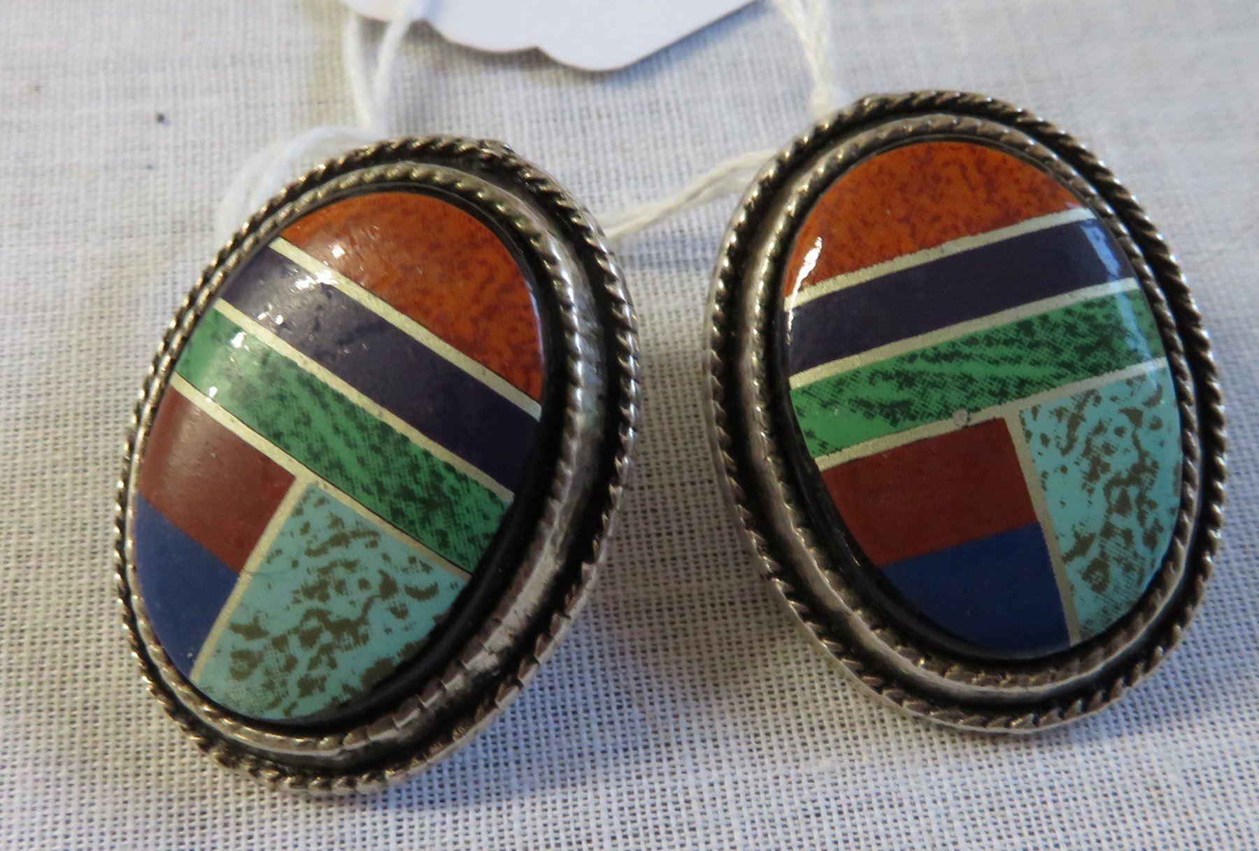 Silver & Stone Earrings, c. 1960s. Made of silver alloy and various inlaid stones, the items each measure 1" x 1 1/8". Southwest USA. Weighs a total of 7.5 grams. Fine stonework. Condition: Good, one missing backing, see images. Shipping: $9.75 w/insurance and signature.