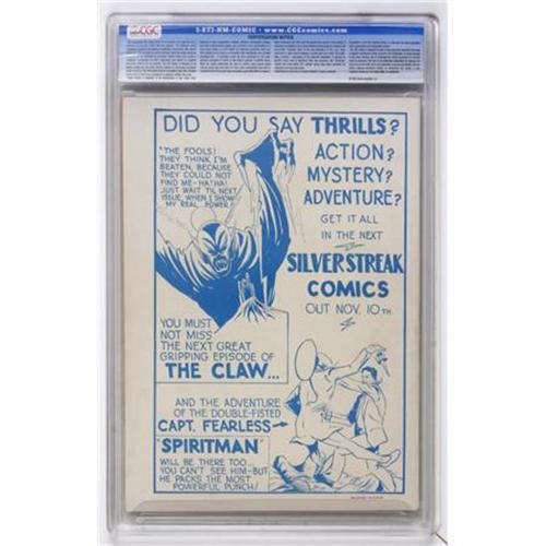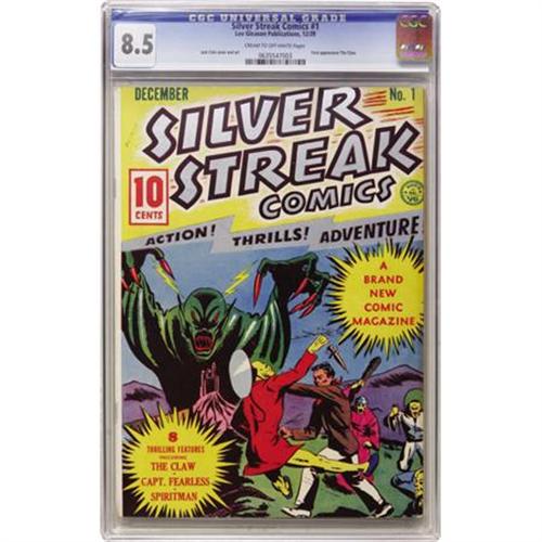 <B>Silver Streak Comics #1 (Lev Gleason, 1939) CGC VF+ 8.5 Cream to off-white pages.</B></I> Here's the first comic book by the company that would soon be known as Lev Gleason Publications (here still called Rhoda Publications with the abbreviation "YG" for Your Guide). As the publisher of <B>Crime Does Not Pay</B></I>, <B>Daredevil Comics</B></I> and others, the company would go on to be one of the most successful Golden Age publishers. This issue's content came from the "shop" of artists known as Funnies Inc., which included big names like Jack Cole and Bill Everett. No mystery how the title got its name -- there's actually metallic ink on the cover as a little gimmick to stand out at newsstands. One thing we've always found peculiar about this issue is that it's got an ad for Timely's <B>Marvel Mystery Comics</B></I> #2 on the inside back cover (the connection being that the Timely book was also a Funnies Inc. production). Also notable about this issue is that it's got the first appearance of the Claw, drawn by Cole. Claw was one of the first supervillains in comics, period, and being fanged, clawed, huge, and evil, not necessarily in that order, he remains one of the more formidable foes comics have seen. All of this contributes to the issue's Overstreet ranking as one of the 100 most valuable Golden Age books; the catch is that it's harder to find than most of the others, earning Overstreet's "scarce" designation. Overstreet 2007 VF 8.0 value = $7,420; VF/NM 9.0 value = $12,360. CGC census 6/07: 1 in 8.5, 2 higher.<BR><BR><b>Shipping:</b> Comics - Slabbed (certified) (<a target="_blank" href="http://www.heritageauctions.com/common/shipping.php">view shipping information</a>)