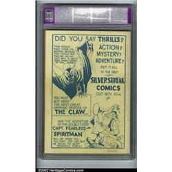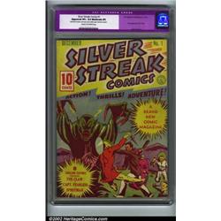 Silver Streak Comics #1 (Lev Gleason, 1939). A truly classic and unique book, Silver Streak #1 is a great conversation piece. Metallic ink was used to print the logo, pre-dating the foil-cover craze of the 1990s by a full half-century. It's the first appearance of the Claw by Jack Cole, one of the coolest villains of the Golden Age, and it's quite scarce. But what's really interesting is the ad for Marvel Mystery Comics #2 on the inside back cover, considering that the book is printed by Lev Gleason and not Timely. Both publishers bought their contents from Funnies, Inc., which may explain the crossover. A fascinating book nonetheless, this copy has moderate restoration to the spine and edges, including piece replacement and color touch, and has been cleaned. The resulting appearance is beautiful. CGC Apparent VF+ 8.5 Moderate (P) Cream to off-white pages. Overstreet 2001 FN 6.0 value = $3,000; VF 8.0 value = $6,500.  Important notice: We expect to be auctioning lots at the rate of 200-250 per hour. Sometimes eBay Premier live bid software cannot keep up with that pace, so we strongly recommend that you place a realistic proxy bid now as insurance to avoid disappointment. Also please note that all Heritage/CAA lots purchased through eBay Premier carry a 20% Buyer's Premium.
