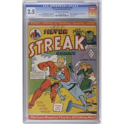 <B>Silver Streak Comics #10 (Lev Gleason, 1941) CGC GD+ 2.5 Off-white to white pages.</B></I> Origin and first appearance of Captain Battle. Daredevil battles the Claw. Robot cover by Bob Wood. Jack Cole and Dick Briefer art. Overstreet 2006 GD 2.0 value = $172. CGC census 2/06: 1 in 2.5, 1 higher. <I>From the Collection of Harold Curtis.</B></I>