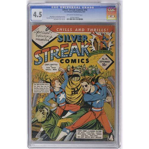 <B>Silver Streak Comics #14 (Lev Gleason, 1941) CGC VG+ 4.5 Off-white to white pages.</B></I> Nazi skull men on the cover are all the reasons you need to go after this comic! Plus it's not a book that's easy to find -- only one other copy has even been certified as of this writing. Jack Binder drew the swastika-swathed skeletons on the cover. Daredevil appears in the book as well. Overstreet 2006 VG 4.0 value = $174. CGC census 2/06: 1 in 4.5, 1 higher. <I>From the Collection of Harold Curtis.</B></I>