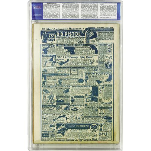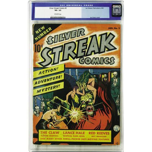 <B>Silver Streak Comics #2 (Lev Gleason, 1940) CGC VG- 3.5 Off-white pages.</B></I> Joe Simon illustrated this second issue's cover, featuring the Claw. Jack Cole art is featured on the Claw story inside, along with more Simon art (on the Solar Patrol tale). And yes, the silver ink used on the cover's logo is still shiny! Overstreet 2006 VG 4.0 value = $774. CGC census 6/06: 2 in 3.5, 3 higher. <BR><BR><B>Important notice:</B> Heritage usually auctions material at the rate of 200-250 lots per hour. On some occasions eBay Live bid software or the Internet may not be able to keep up with the pace of the auction. We recommend placing a realistic absentee bid now as insurance to avoid disappointment. Occasionally the auctioneer may eliminate or reject an eBay Live bid, and the auctioneer may also reopen a lot after the close of the eBay live bidding (usually because we missed an audience bid), and may reject your bid even if it shows you as the winning bidder. By bidding via eBay Live, you agree that Heritage may award the lot to another bidder at its sole discretion under the circumstances described above or any other reasonable circumstances. Since eBay bids are not shown to us until we open the lot on the floor, we treat those bids just like floor bids. In most cases the floor responds before the eBay bid is presented to us, due to Internet lag time, so for consistency we have made it a policy that floor bids are always considered first over tie eBay live bids. Also please note that all Heritage lots purchased through eBay Live carry a 22.5% Buyer's Premium. Please make sure you read the Terms and Conditions before you bid. This lot is being auctioned in conjunction with a live floor auction by Heritage Auction Galleries. All final auction and invoice information will be supplied by Heritage Auction Galleries, and all other information should be considered preliminary. Lot:41001 <BR><BR><B>Winning Notification and Billing:</B> After the FINAL session in this auction is complete, Heritage will send e-mail and snail mail invoices. This process normally takes several days. All final auction and invoice information will be supplied by Heritage Auction Galleries, and all other information should be considered preliminary. <BR><BR>This auction will be conducted on a live auction floor and over the Internet through eBay Live. If you choose to place an absentee bid, please take a moment to <font color='#0000ff'><u><a href='http://pages.ebay.com/liveauctions/help/before/laabsentee.html'>learn how eBay Live absentee bidding works</a></u></font><font color='#000000'>