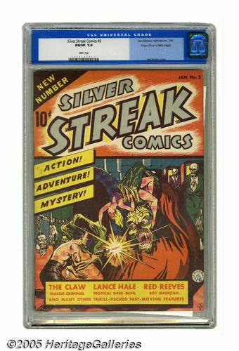 <B>Silver Streak Comics #2 Mile High pedigree (Lev Gleason, 1940) CGC FN/VF 7.0 White pages.</B></I> The Claw was one of the most fearsome villains of the Golden Age, and in this comic he was drawn by two of the best artists of that era, Joe Simon (cover) and Jack Cole (interior story). If you're wondering where the title got its name, have a look at the metallic ink on the cover, a gimmick that looks neat even today! Overstreet 2005 FN 6.0 value = $1,158; VF 8.0 value = $2,509. CGC census 5/05: 1 in 7.0, 1 higher.