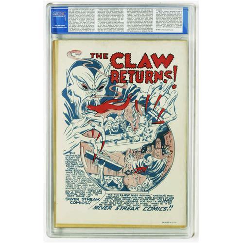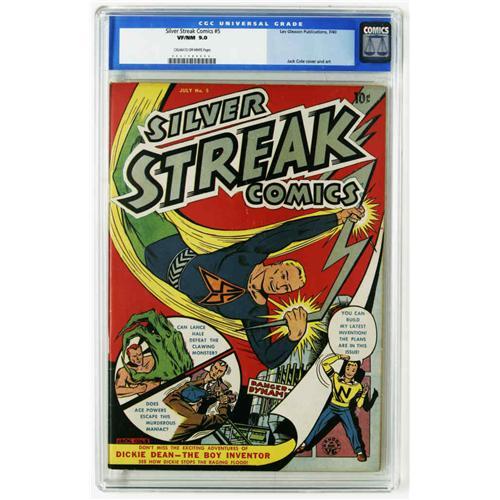 <B>Silver Streak Comics #5 (Lev Gleason, 1940) CGC VF/NM 9.0 Cream to off-white pages.</B></I> Jack Cole produced no fewer than three stories in this issue (two featuring the Claw, one starring "boy inventor" Dickie Dean), as well as a cool cover with silver ink. Please be sure to check out the back cover image (shown online at the Heritage website) for a wild "Claw Returns" illustration, complete with a lovely girl in bondage! A great Golden Age comic, and a wonderful, fresh-looking copy make this one a "must-bid" situation! Overstreet 2005 VF/NM 9.0 value = $1,925; NM- 9.2 value = $2,600. CGC census 12/05: 3 in 9.0, none higher.