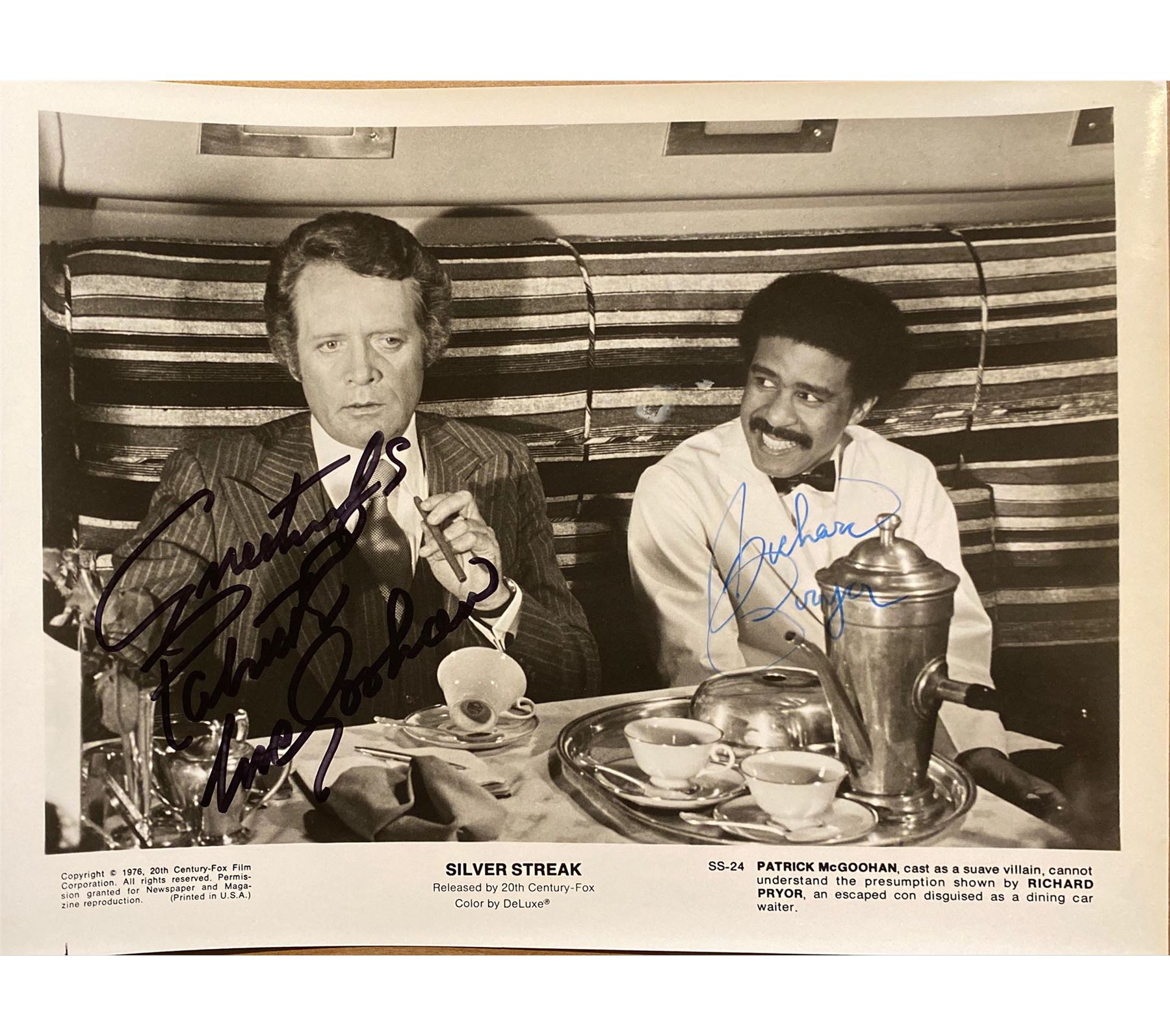 Silver Streak signed black and white movie photo autographed by Richard Pryor and Patrick McGoohan. 8x10 inches