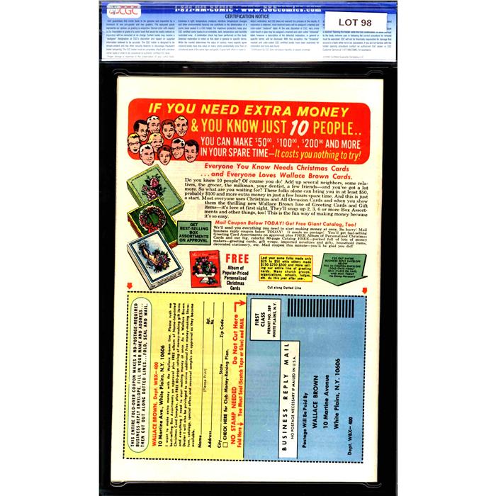 The Auctioneer has reserved the right to reject any and all bids, and to bid at the auction. Auctioneers Auctions are not on approval. Auctioneer does not allow certified material to be returned because of possible differences of opinion with respect to the grade offered by any third party organization, dealer, or service. Absolutely no guarantee of grade is offered for un-certified property sold and subsequently submitted to a third-party grading service. There will be no exceptions to this policy. Under extremely limited circumstances, (e.g. gross cataloging error) a purchaser, who did not bid from the floor, may request Auctioneer to evaluate voiding a sale; such request must be made in writing detailing the alleged gross error, and submission of the lot to the Auctioneer must be pre-approved by the Auctioneer. Bidder must notify Auctioneer in writing of such request within three (3) days of the non-floor bidder receipt of the lot. Any lot that is to be evaluated must be in our offices within 30 days after Auction. Grading does not qualify for this evaluation process nor do such complaints constitute a basis to challenge the authenticity of a lot. AFTER THAT 30-DAY PERIOD, NO LOTS MAY BE RETURNED FOR REASONS OTHER THAN AUTHENTICITY. Lots returned must be housed intact in the original holder. No lots purchased by floor Bidders may be returned (including those Bidders acting as agents for others). Late remittance for purchases may be considered just cause to revoke all return privileges. B: Auctions conducted solely on the Internet have a THREE (3) DAY RETURN POLICY: Lots paid for within seven days of the Auction closing are sold with a three (3) day return privilege. You may return lots under the following conditions: Within three days of receipt of the lot, you must first notify Auctioneer by contacting Client Service by phone (314-680-8599) or e-mail (moundcityauctions@gmail.com), and immediately mail the lot(s) fully insured to the attention of Returns, Mound City Auctions 1081 Teson Rd. Hazelwood, MO. 63042. Lots must be housed intact in their original holder and in their original condition. You are responsible for the insured, safe delivery of any lots. Auctioneer will not be responsible for lots returned in non-registered mail or lots returned without prior authorization per section B. A non-negotiable return fee of 5% of the purchase price ($10 per lot minimum) will be deducted from the refund for each returned lot or billed directly. Postage and handling fees are not refunded. After the three-day period (from receipt), no items may be returned for any reason. Late remittance for purchases revokes all Return-Restock privileges. C: Bidders who have inspected the lots prior to the auction will not be granted any return privileges. D: Comic books sold referencing a third-party grading service are sold “as is” without any express or implied warranty. Certain warranties may be available from the grading services and the Bidder is referred to them for further details: Certified Guaranty Company, LLC. (CGC), P.O. Box 4738, Sarasota, FL 34230. E: Bidders who intend to challenge authenticity or provenance of a lot must notify Auctioneer in writing within thirty (30) days of the Auctions conclusion. In the event Auctioneer cannot deliver the lot or subsequently it is established that the lot lacks title, provenance, authenticity, or other transfer or condition issue is claimed, Auctioneer's liability shall be limited to rescission of sale and refund of purchase price; in no case shall Auctioneer's maximum liability exceed the high bid on that lot, which bid shall be deemed for all purposes the value of the lot. After one year has elapsed, Auctioneer's maximum liability shall be limited to any commissions and fees Auctioneer earned on that lot. F: All comics are guaranteed genuine, but are not guaranteed as to grade, since grading is a matter of opinion, an art and not a science, and therefore the opinion rendered by the Auctioneer or any third party grading service may not agree with the opinion of others (including trained experts), and the same expert may not grade the same item with the same grade at two different times. G: Since we cannot examine encapsulated comics, they are sold “as is”without our grading opinion, and may not be returned for any reason. Auctioneer shall not be liable for any patent or latent defect or controversy pertaining to or arising from any encapsulated collectible. In any such instance, purchaser's remedy, if any, shall be solely against the service certifying the collectible. H: Due to changing grading standards over time, differing interpretations, and to possible mishandling of items by subsequent owners, Auctioneer reserves the right to grade items differently than shown on certificates from any grading service that accompany the items. Auctioneer also reserves the right to grade items differently than the grades shown in the prior catalog should such items be reconsigned to any future auction. I: Although consensus grading is employed by most grading services, it should be noted as aforesaid that grading is not an exact science. In fact, it is entirely possible that if a lot is broken out of a plastic holder and resubmitted to another grading service or even to the same service, the lot could come back with a different grade assigned. J: Certification does not guarantee protection against the normal risks associated with potentially volatile markets. The degree of liquidity for certified collectibles will vary according to general market conditions and the particular lot involved. For some lots there may be no active market at all at certain points in time."