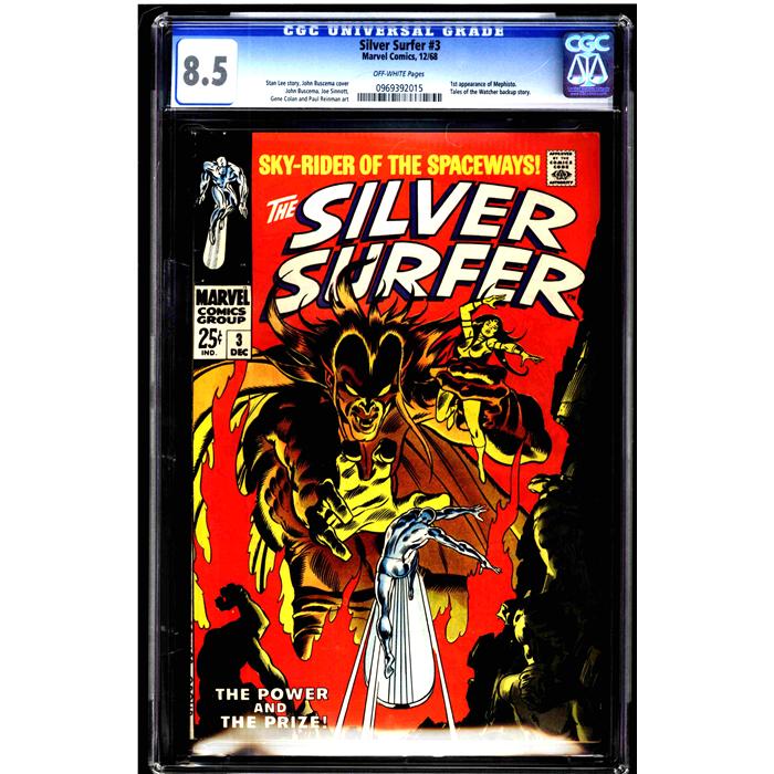 Silver Surfer #3 CGC 8.5 off-white pages. Stan Lee story John Buscema cover, John Buscema Joe Sinnott Gene Colan and Paul Reinman art Tales of the Watcher backup story. 1st appearance of Mephisto. Overstreet 2009 VF 8.0 value = $111, VF/NM 9.0 value = $206. CGC census: 55 at 8.5, 135 higher.