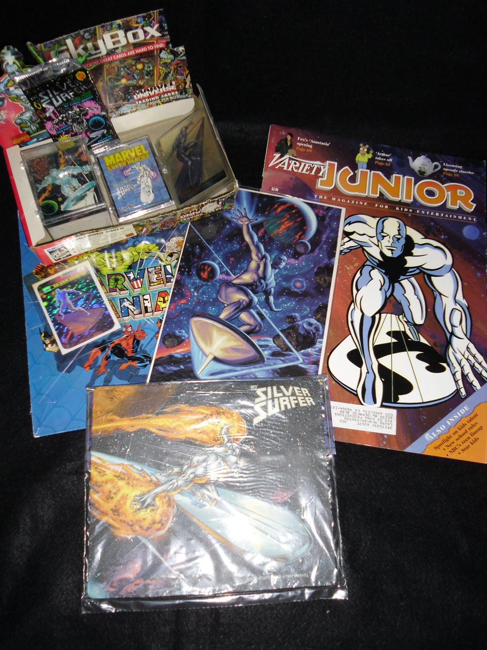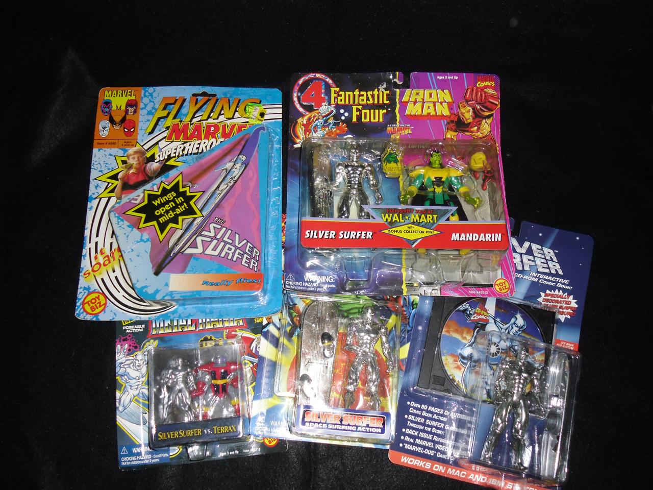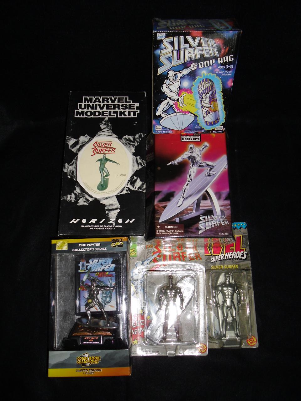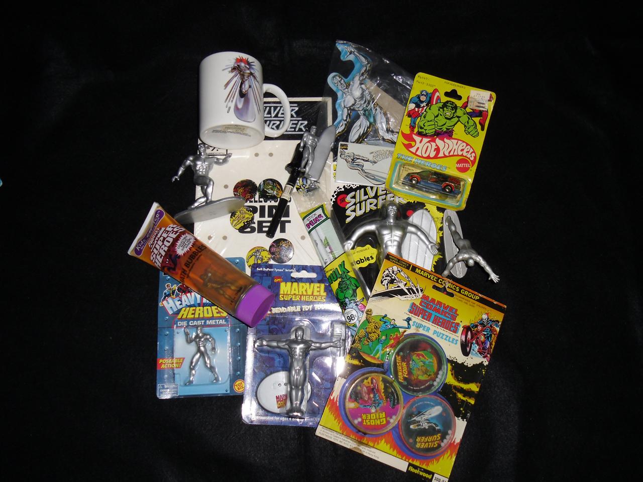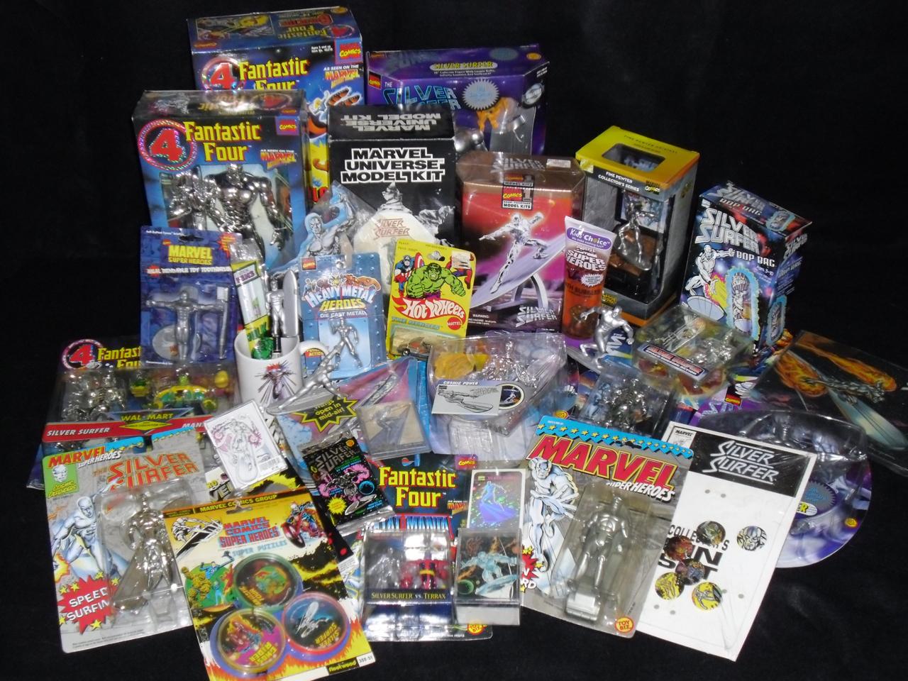Silver Surfer - Collection of Modern and Vintage Merchandise from the 1970's - 2000's. An almost complete collection of merchandise related the Marvel super-hero The Silver Surfer. Includes items beginning in the 1970's such as a matchbox car, pencils, and hand games and on into the 1980's with models and action figures and into the 1990's and early 2000's with action figures, collectors cards, die cast metal figures, mouse pads, coffee cups and lots more. Took over 20 years to collect. Most items are new, sealed in the box and in mint condition.