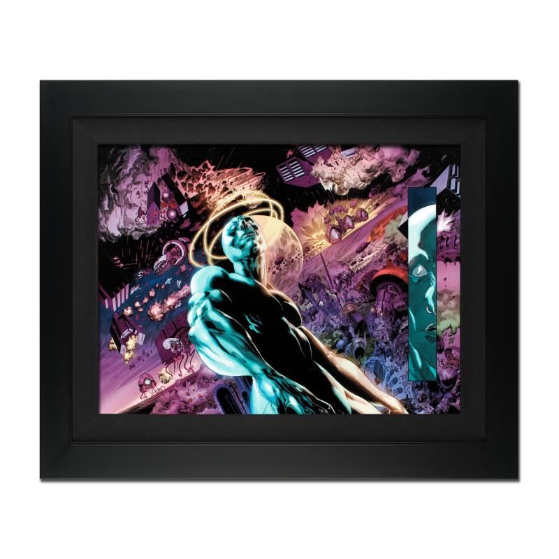 A piece of comic book history, this limited edition, from original art by Tan Eng Huat, depicts the famous Silver Surfer. Named 'Best New Talent' in the National Comics Awards (NCA) 2002, Tan Eng Huat has been a featured artist for different comic companies such as Marvel. He is most recognized for his work on the Punisher, Ghost Rider, Annihilators, and Deadpool comics. "Silver Surfer: In Thy Name #3" an extremely limited edition giclee on canvas by Tan Eng Huat presented by Marvel Comics, hand signed by the Great Stan Lee (1922-2018) and numbered out of only 10! This piece comes custom framed and ready to hang. Includes Certificate of Authenticity! Measures approx. 31" x 25" (with frame), 24" x 18" (image).