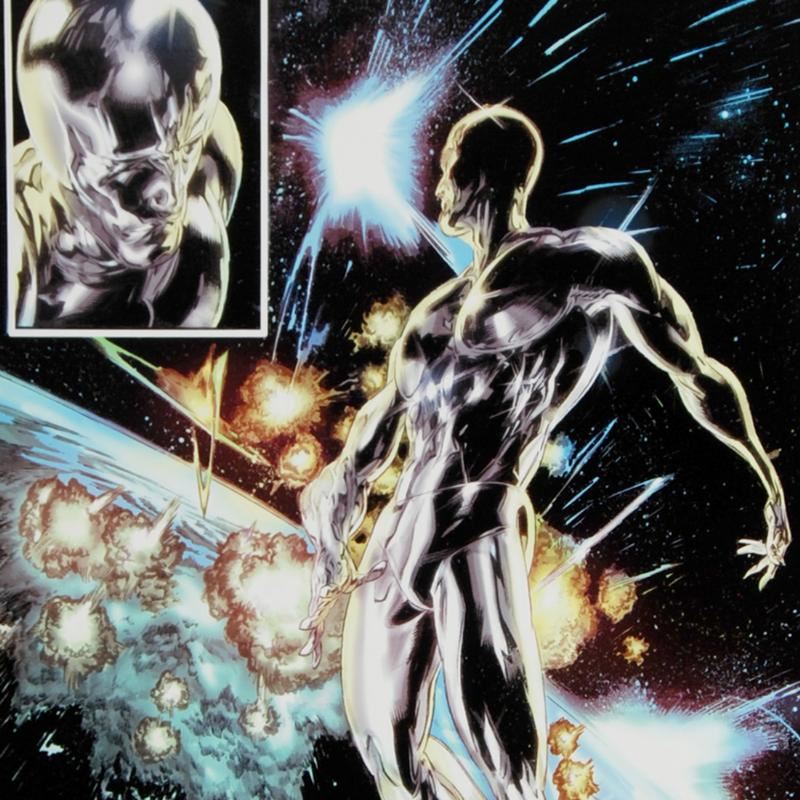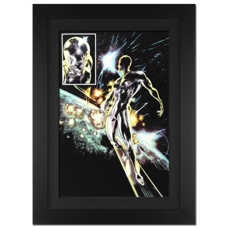 A piece of comic book history, this limited edition, from original art by Tan Eng Huat, depicts the famous Silver Surfer. Named 'Best New Talent' in the National Comics Awards (NCA) 2002, Tan Eng Huat has been a featured artist for different comic companies such as Marvel. He is most recognized for his work on the Punisher, Ghost Rider, Annihilators, and Deadpool comics. "Silver Surfer: In Thy Name #4" an extremely limited edition giclee on canvas by Tan Eng Huat presented by Marvel Comics, hand signed by the great Stan Lee and numbered out of only 10! This piece comes custom framed and ready to hang. Includes Certificate of Authenticity! Measures approx. 25" x 34" (with frame); 18" x 27" (image).