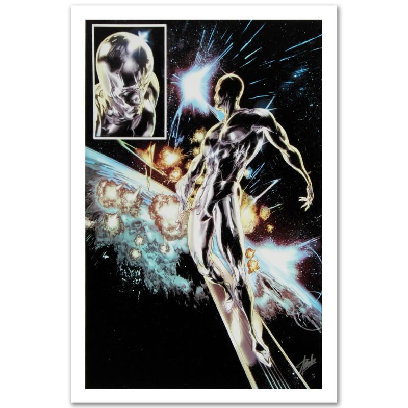 A piece of comic book history, this limited edition, from original art by Tan Eng Huat, depicts the famous Silver Surfer. Named 'Best New Talent' in the National Comics Awards (NCA) 2002, Tan Eng Huat has been a featured artist for different comic companies such as Marvel. He is most recognized for his work on the Punisher, Ghost Rider, Annihilators, and Deadpool comics. "Silver Surfer: In Thy Name #4" is a limited edition numbered giclee on canvas by Tan Eng Huat presented by Marvel Comics, hand signed by the Great Stan Lee (1922-2018). Includes Certificate of Authenticity! Measures approx. 18" x 27" (image).