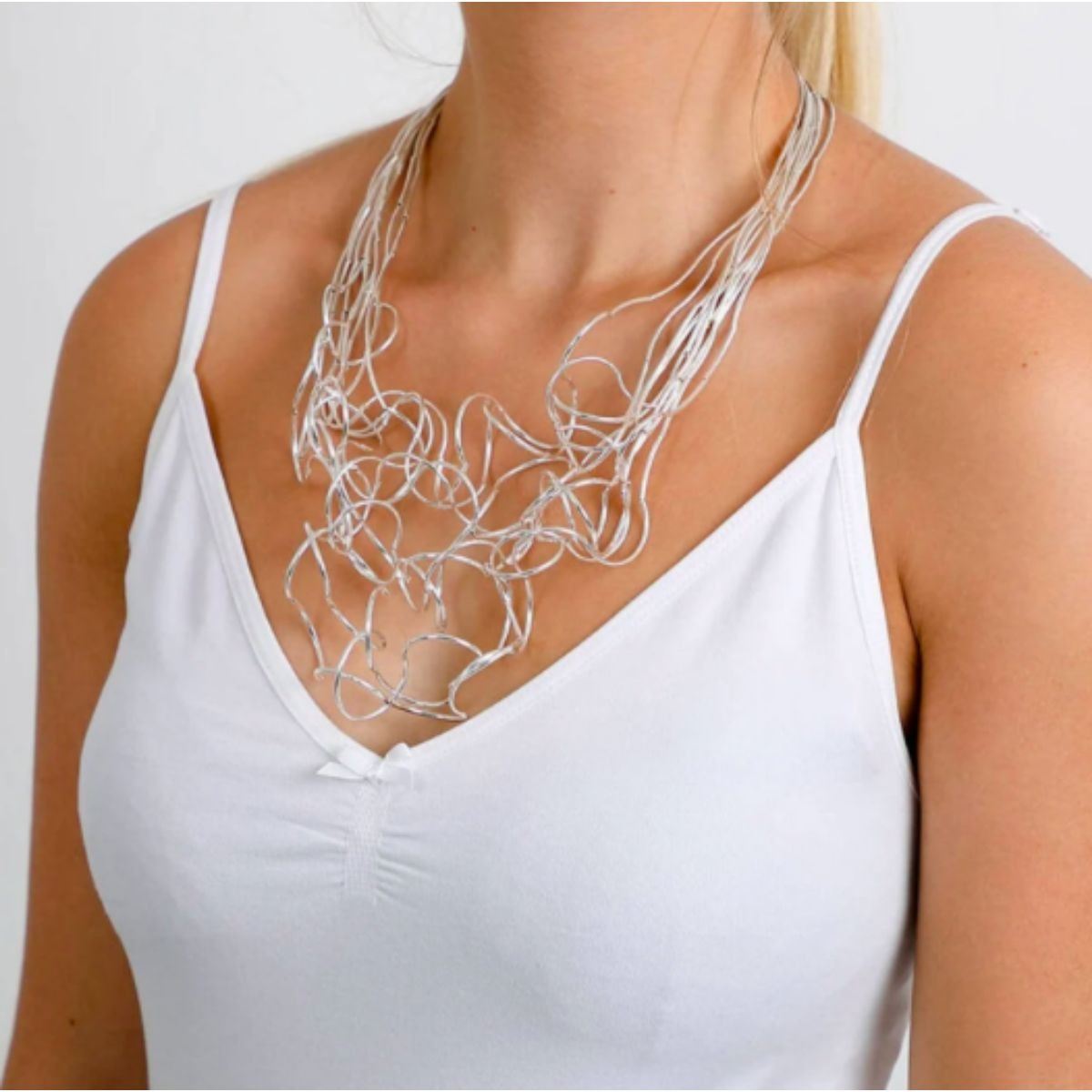 Abstract silver tangled wire statement necklace. Created by English artisan. 18" to 20" with 2" extension. Lightweight with lobster claw clasp.