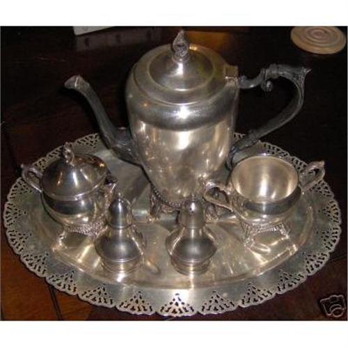 This is a beautiful silverplated display piece. There are 7 pieces. There is a serving plater, sugar bowl, salt and pepper shaker, tea pot and cream pitcher. The set has been polished. The measurements are as follows: