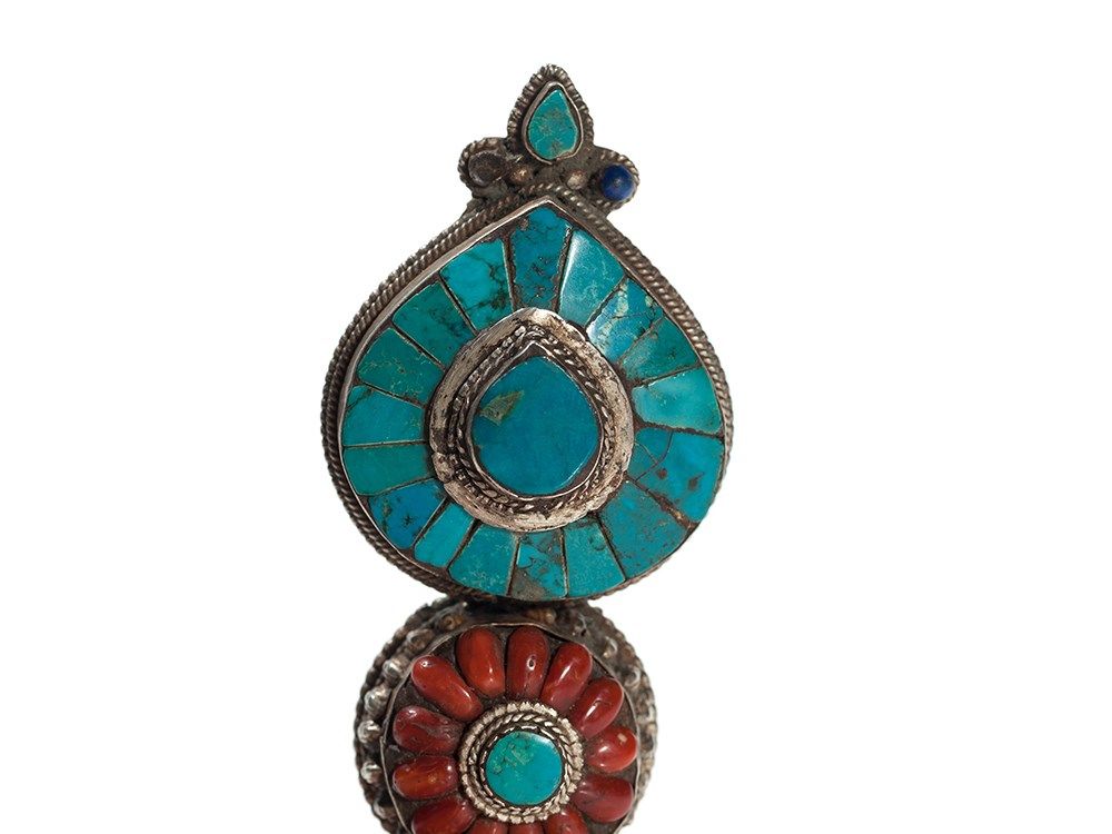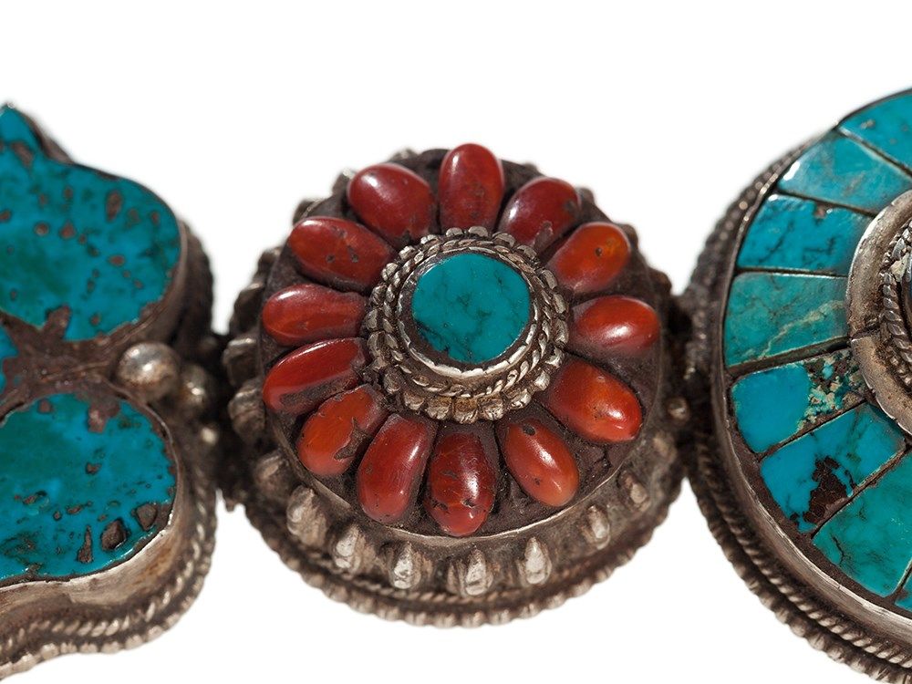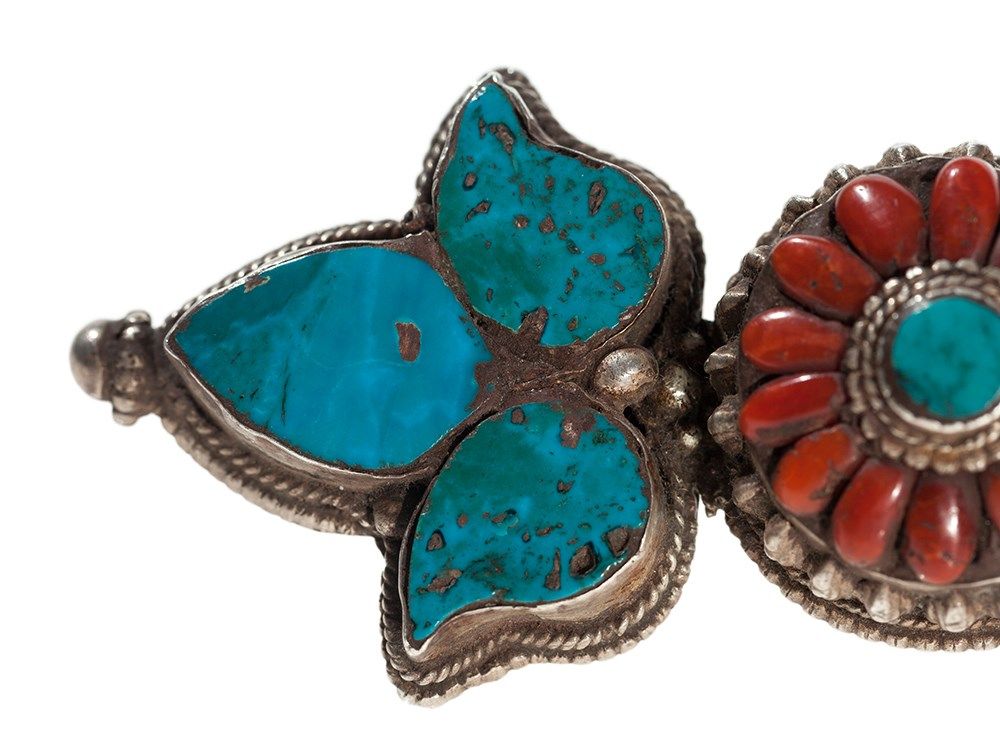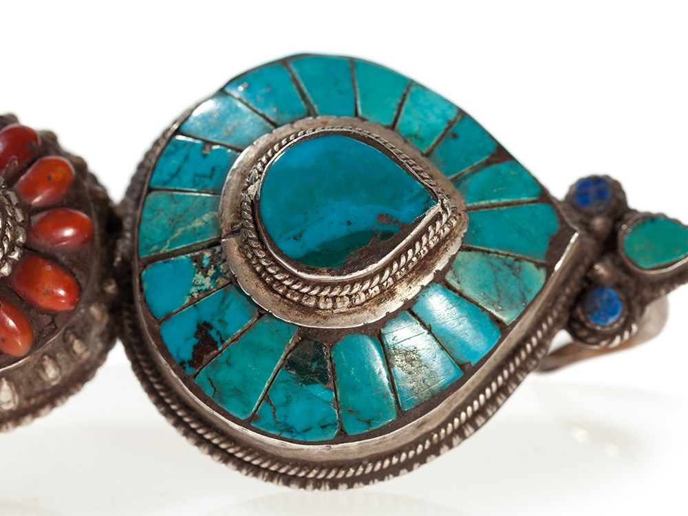 Tibetan jewelry has symbolic character and a protective function. So silver is supposed to protect from evil, coral ensures physical health and a turquoise should safeguard the soul and psyche. By wearing certain items of jewelry, various dignitaries and ministers could express their status or rank. Jewelry was also an investment, used as dowry for marriage and often served as a valuable inheritance. Since Tibetans believed the soul is located within the head area, this is where they primarily wore their jewelry.