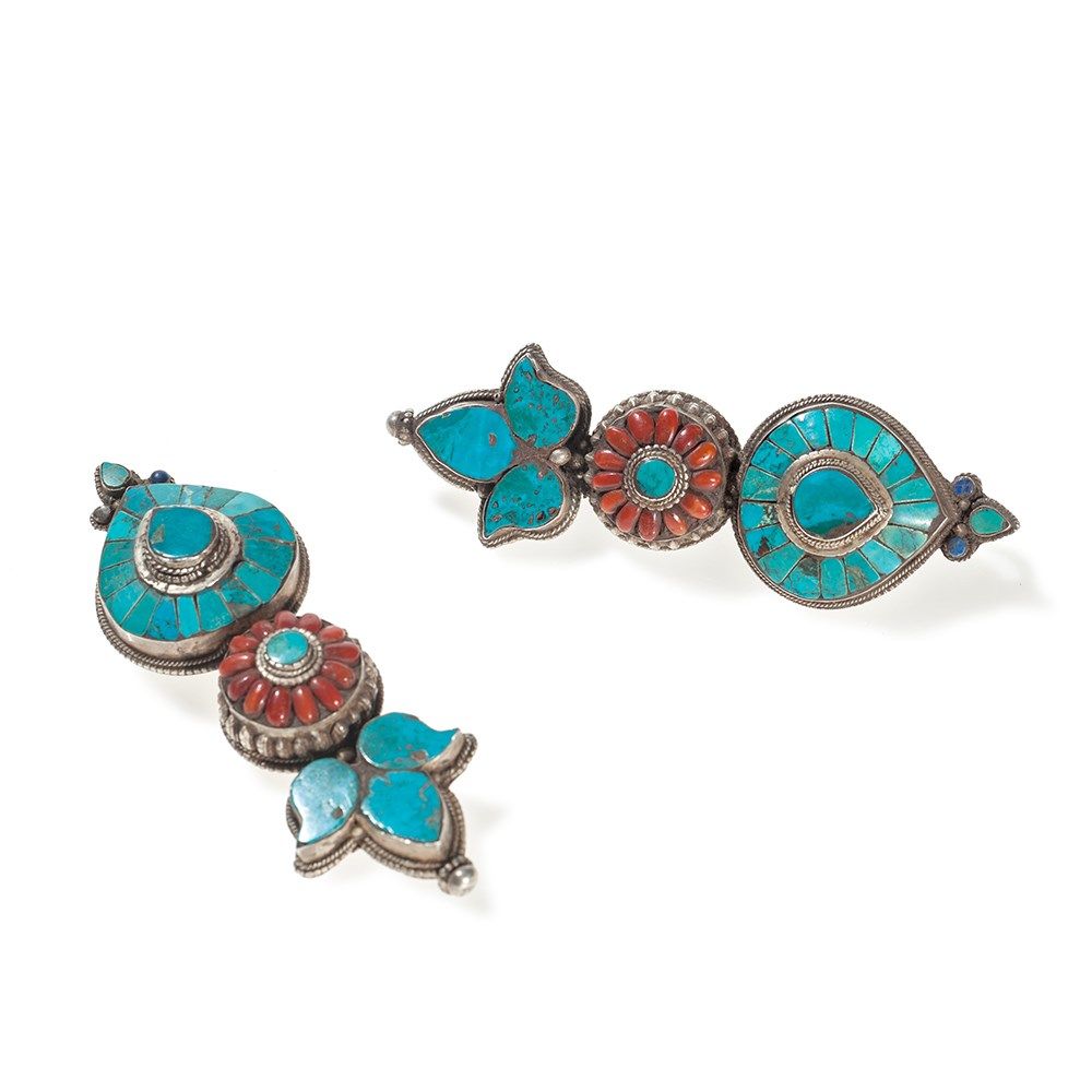 This silver Tibetan temple pendants originated around 1930 and they are decorated with azure turquoise, coral and round lapis lazuli. The pendants are made from optically three ornaments, a teardrop shape, a floral element with oval deep red coral in the middle and three curved turquoises on the lower area. Perl strings also adorn the entire outer edge.