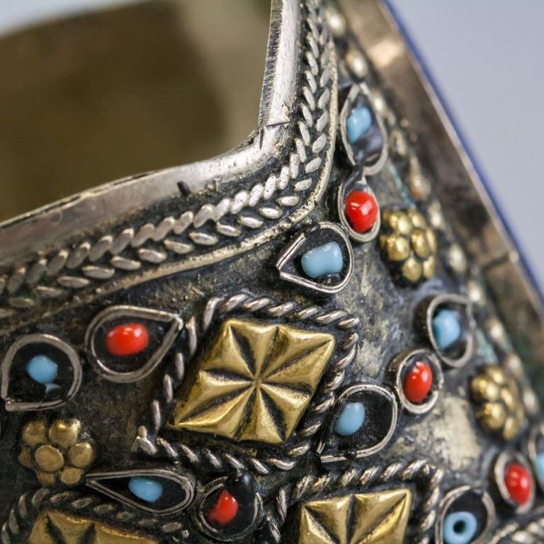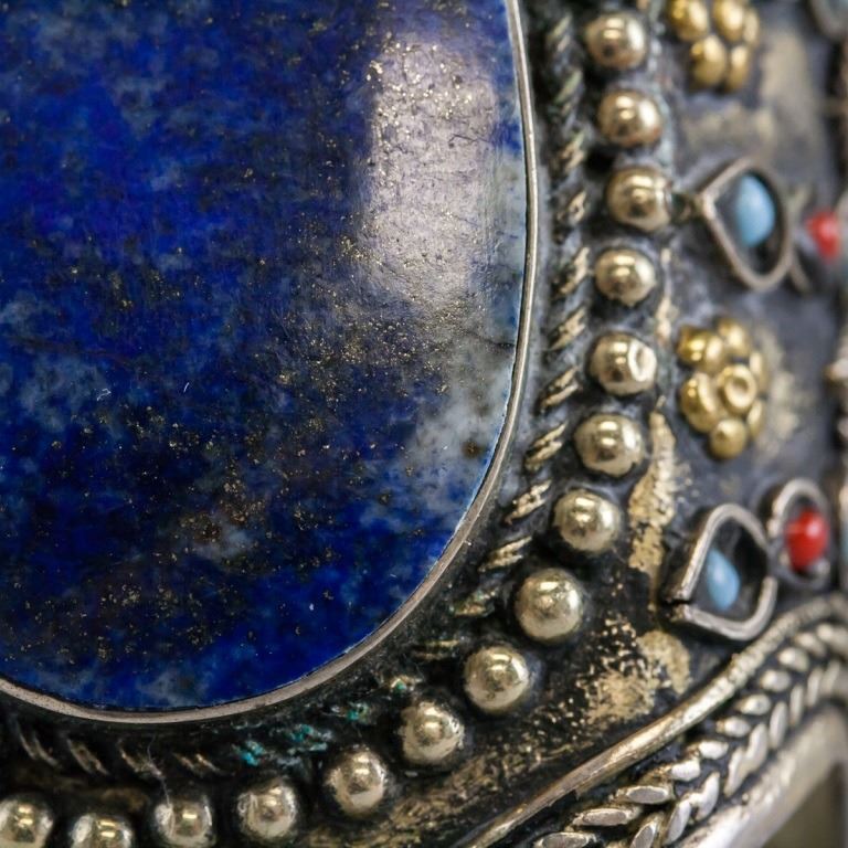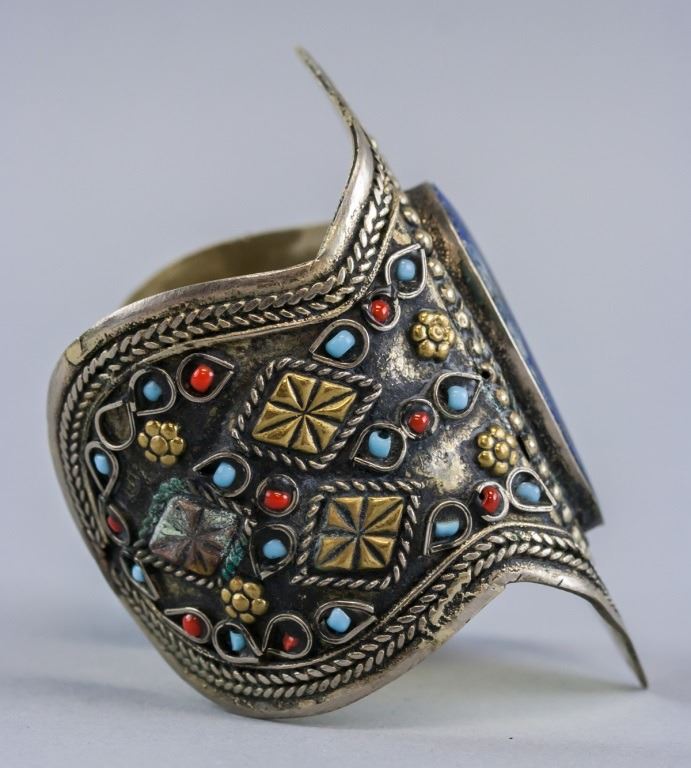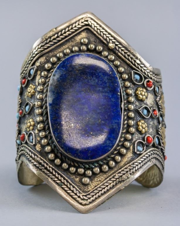 Tibetan bracelet. Of silver tone, with large blue lapis lazuli gemstone. 8 x 6.5 cm. 59 grams. Materials untested.