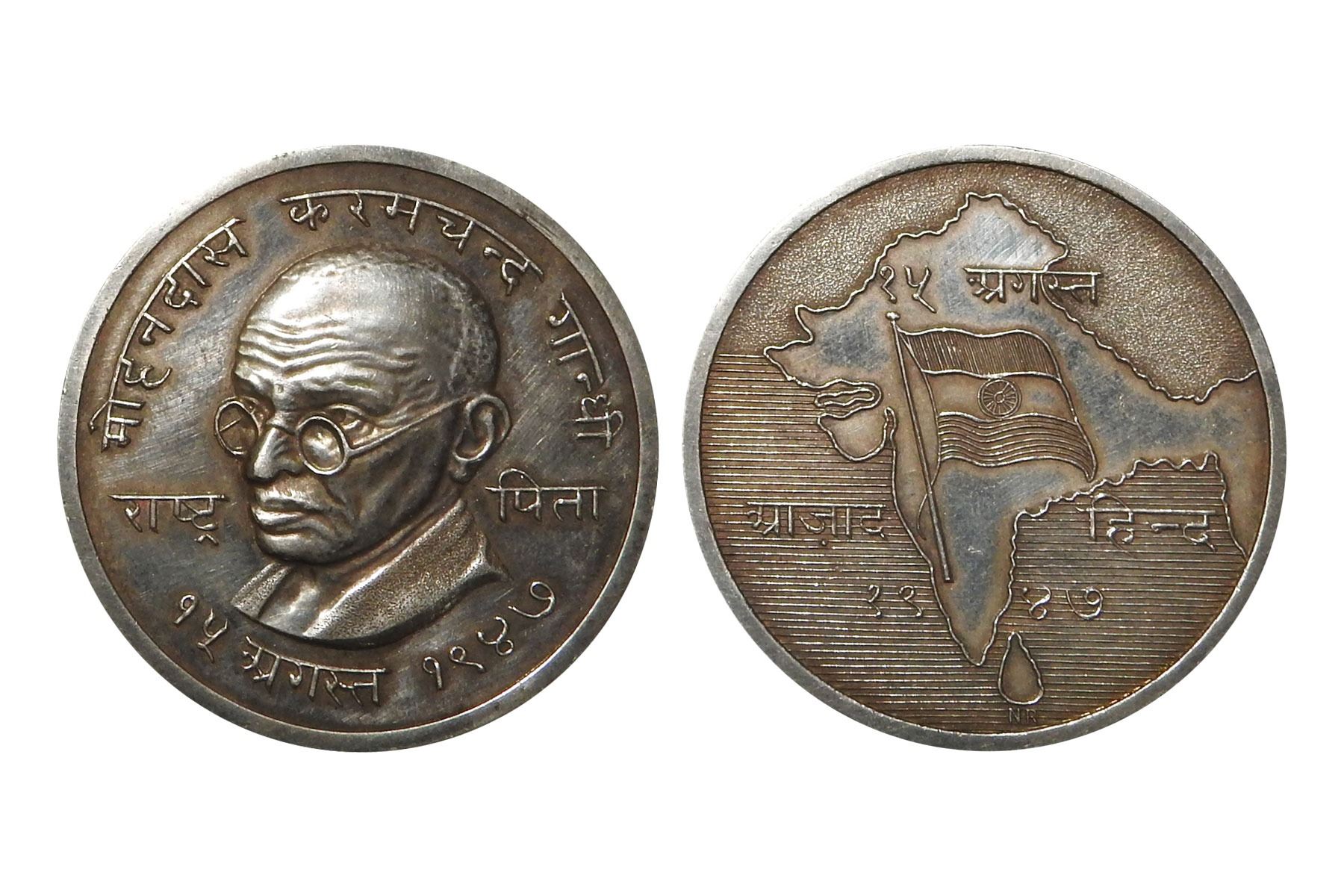 Silver Token, 26.2 grams, Obv: Portrait of Gandhi Ji facing left with hindi legend Mohandas Karamchand Gandhi, Rashtra Pita, 15th August 1947. Rev: Map of India before Independence with Tricolor flag of India in the center and hindi legend 15th August, Azaad Hind 1947.