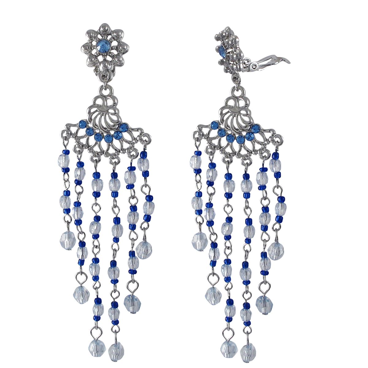 Silver Tone Alloy Clip Earrings With Multi Blue Beads -3.3"