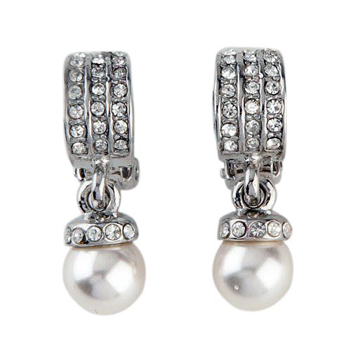 Silver Tone Alloy Hoop Clip-On Earrings With Crystals And Pearl -1.3"