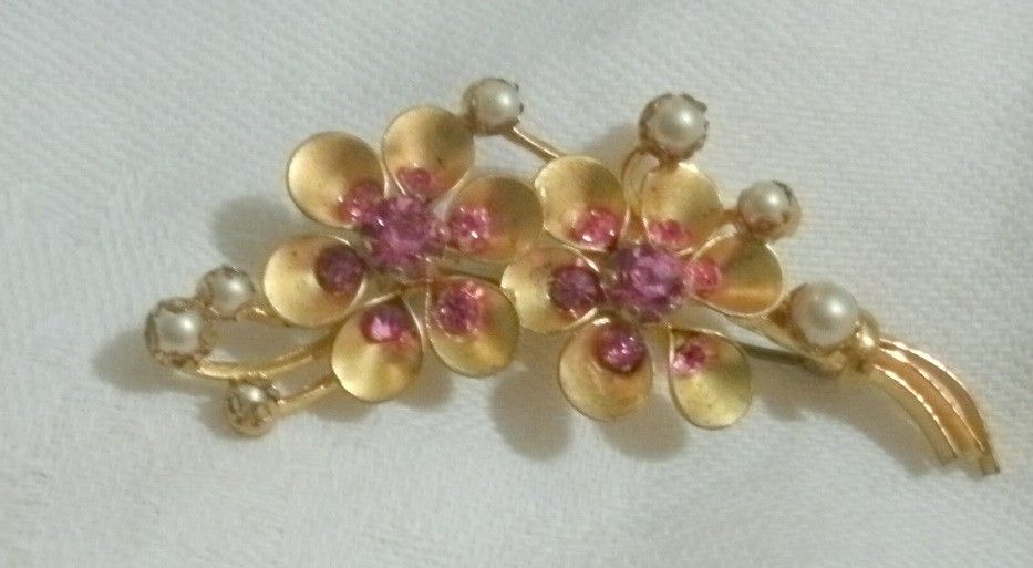 This is a beautiful Large broach/pin silver/silvertone metal with pretty PINK Rhinestone/crystals. No visible markings.