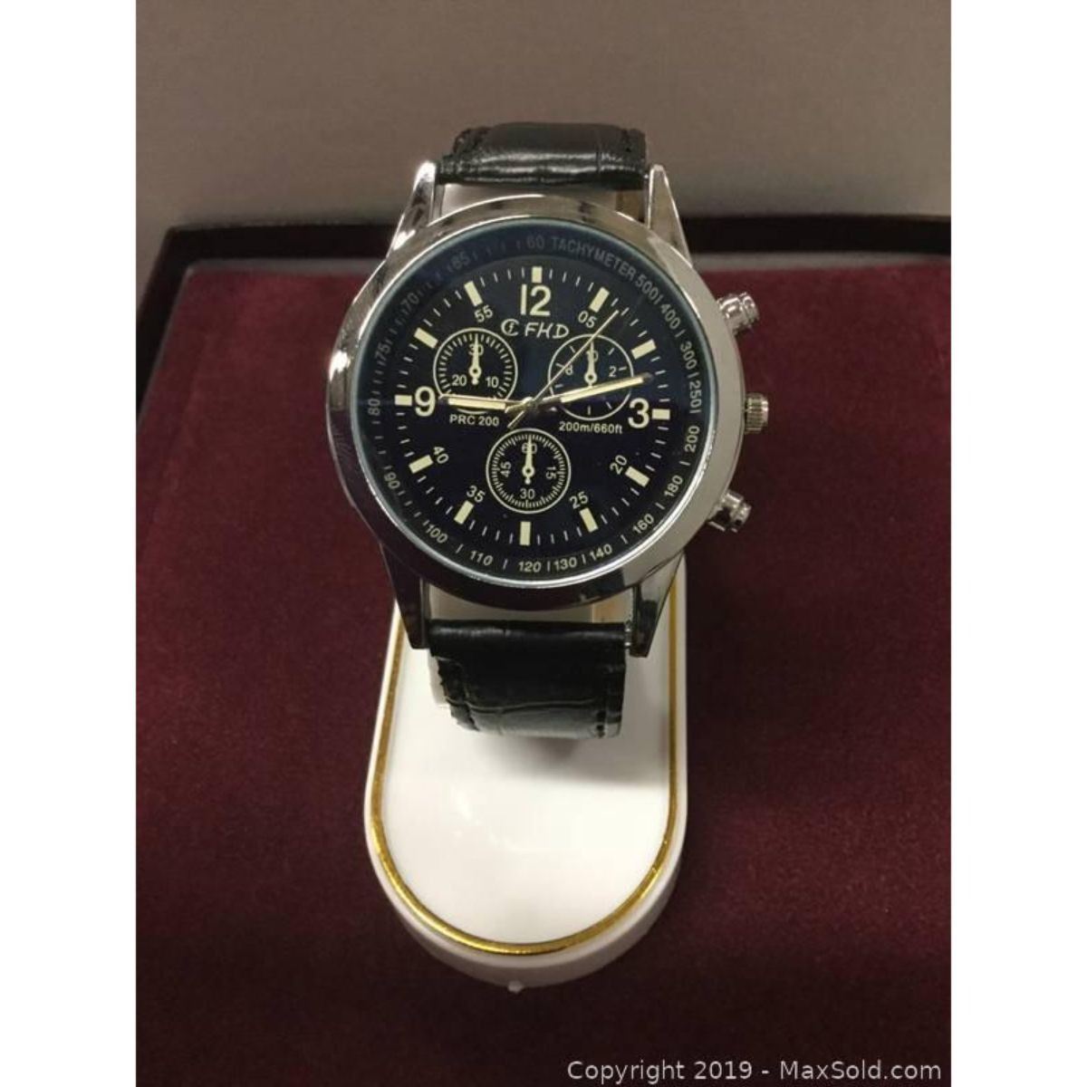 A Silver Colored Mens Wrist Watch With Black Band. View Pictures For Further Details.