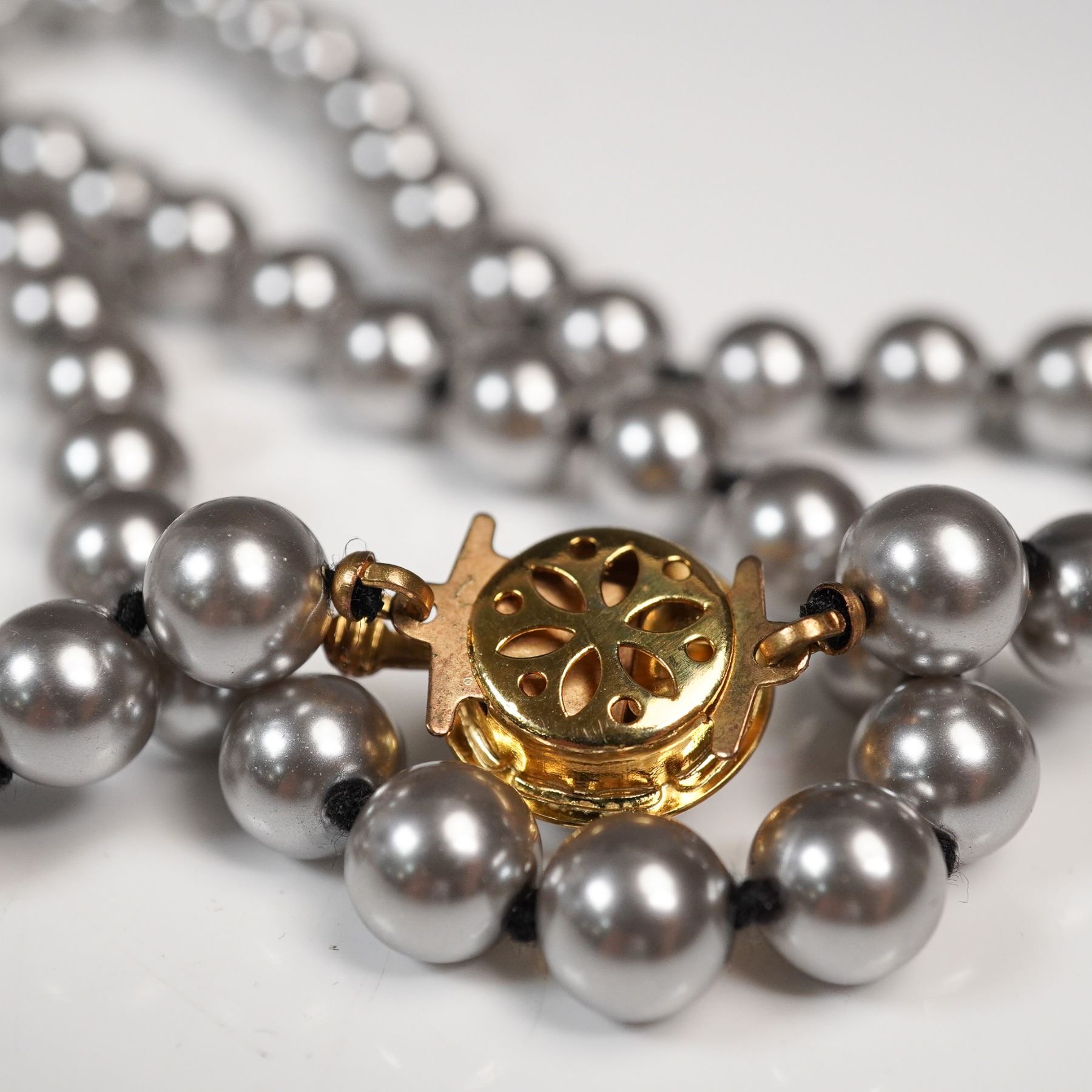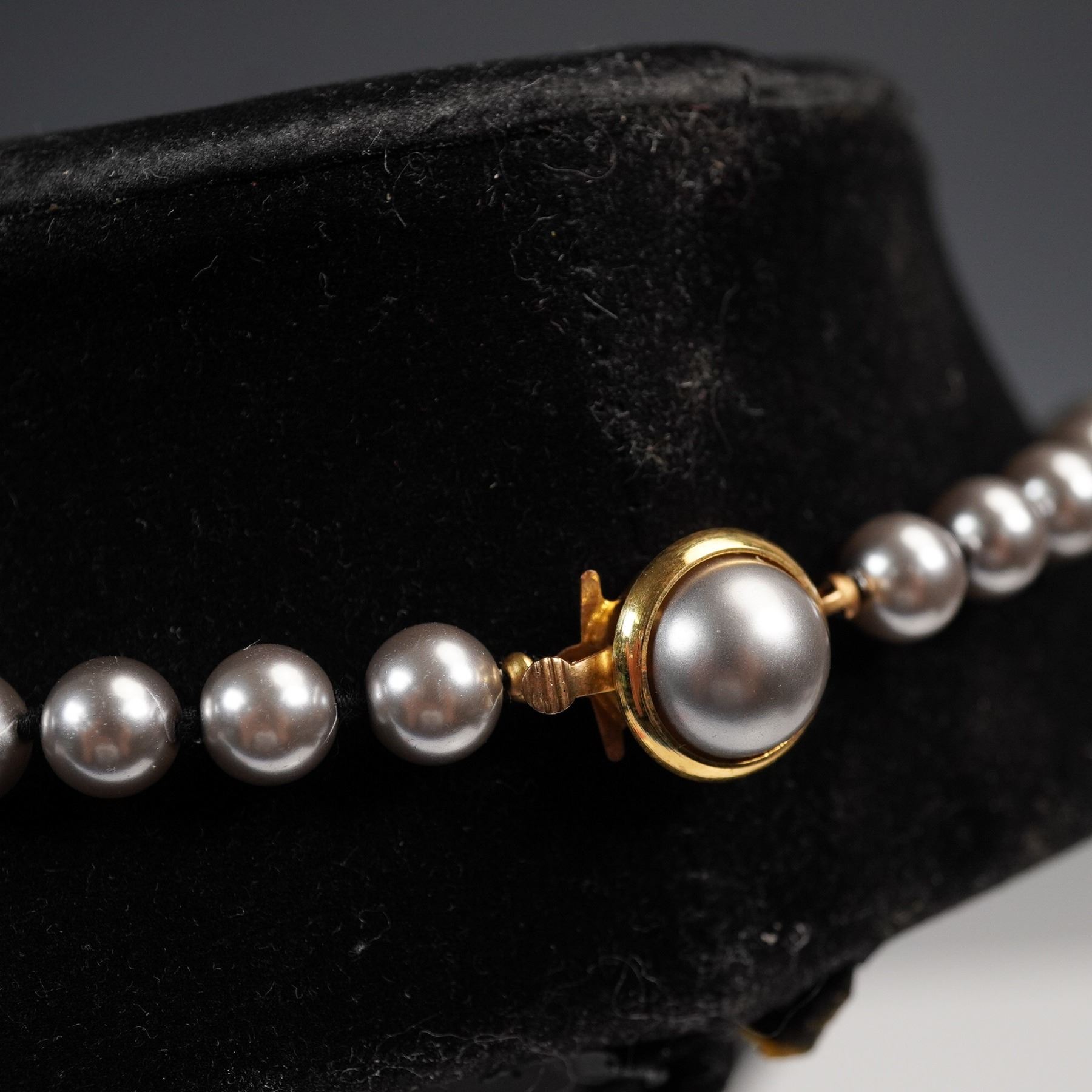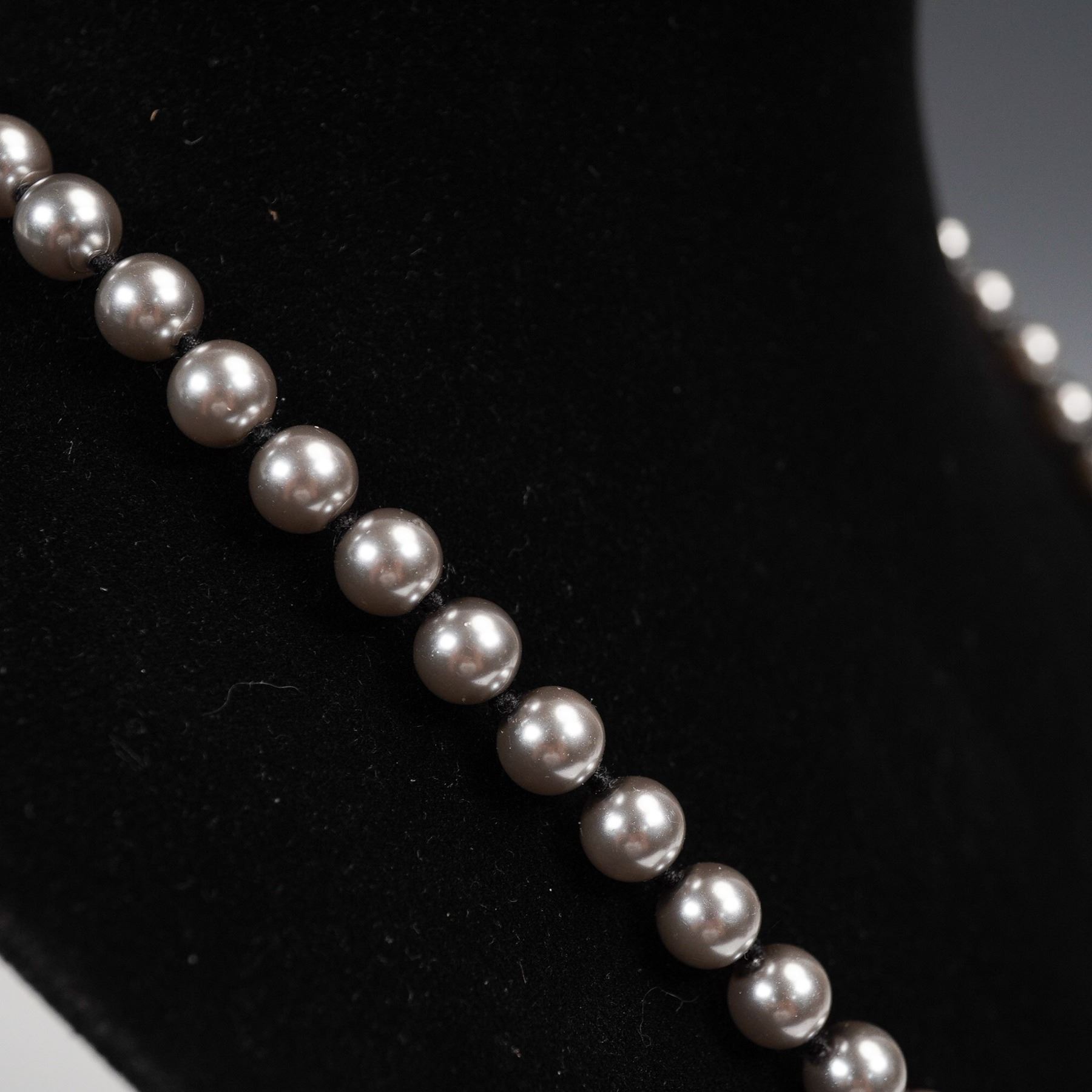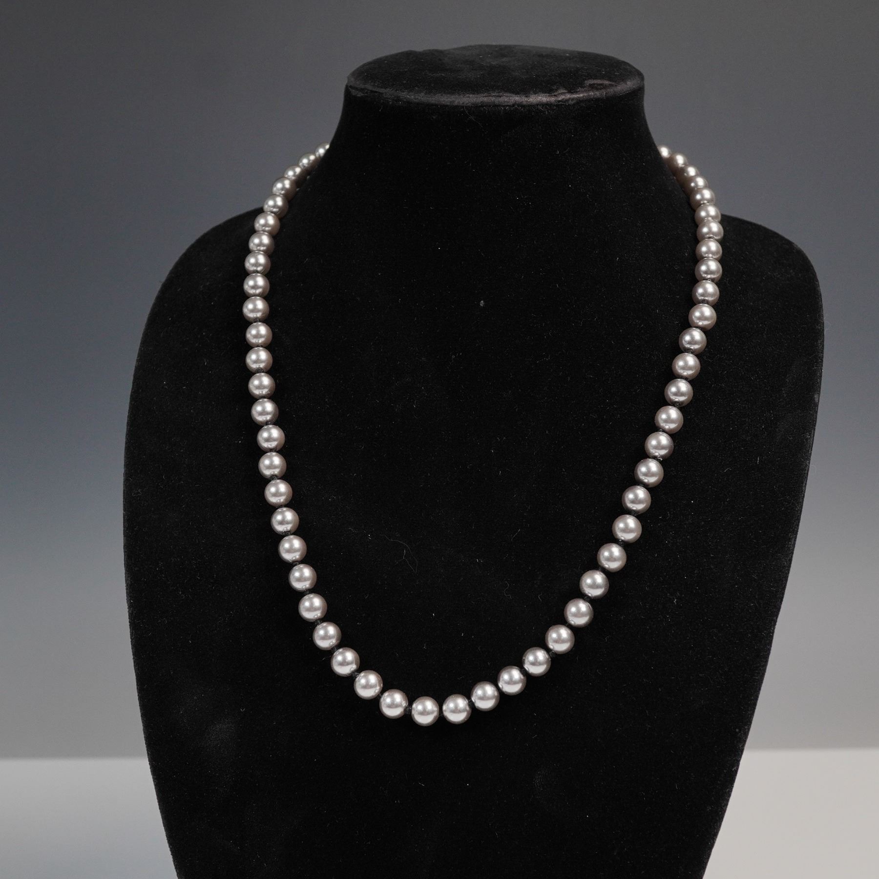 Silver tone faux pearl necklace featuring uniform round beads in a classic single-strand design. The necklace is finished with a decorative gold tone clasp accented by a matching faux pearl. Measures approximately 23.75"L from clasp to clasp. A timeless and versatile piece, perfect for formal occasions or everyday elegance.