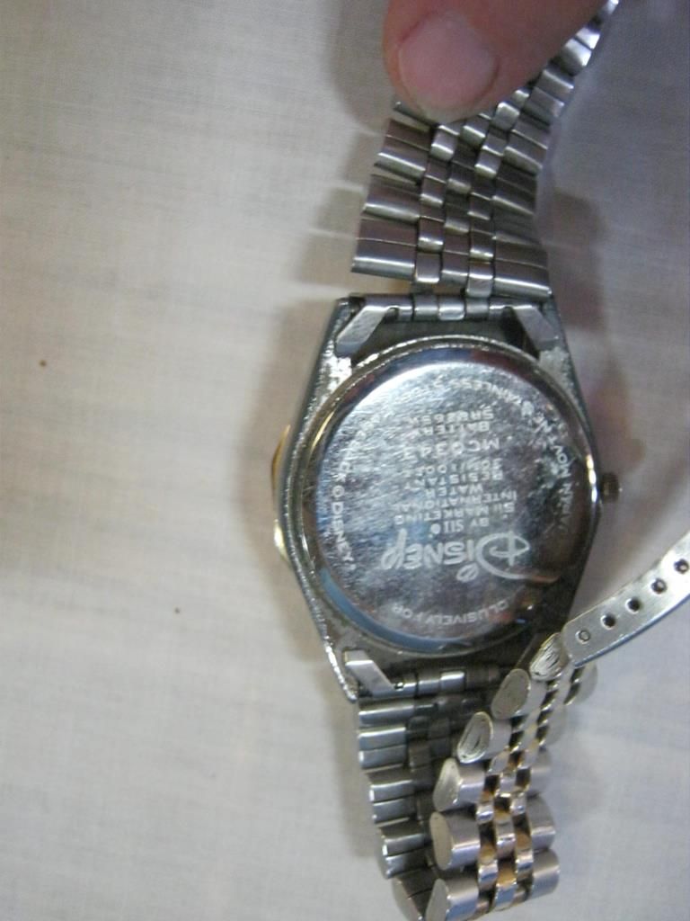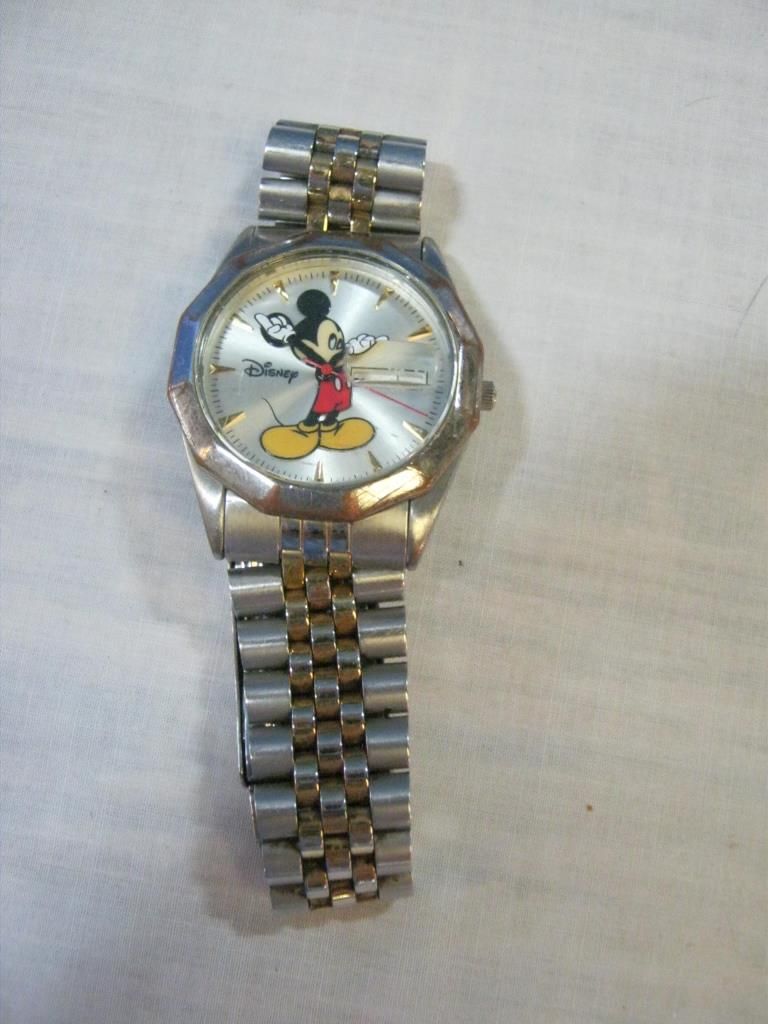 with date * water resistant. 30m/100ft model MCO 343 has date Mickey is in red with yellow shoes and white gloves