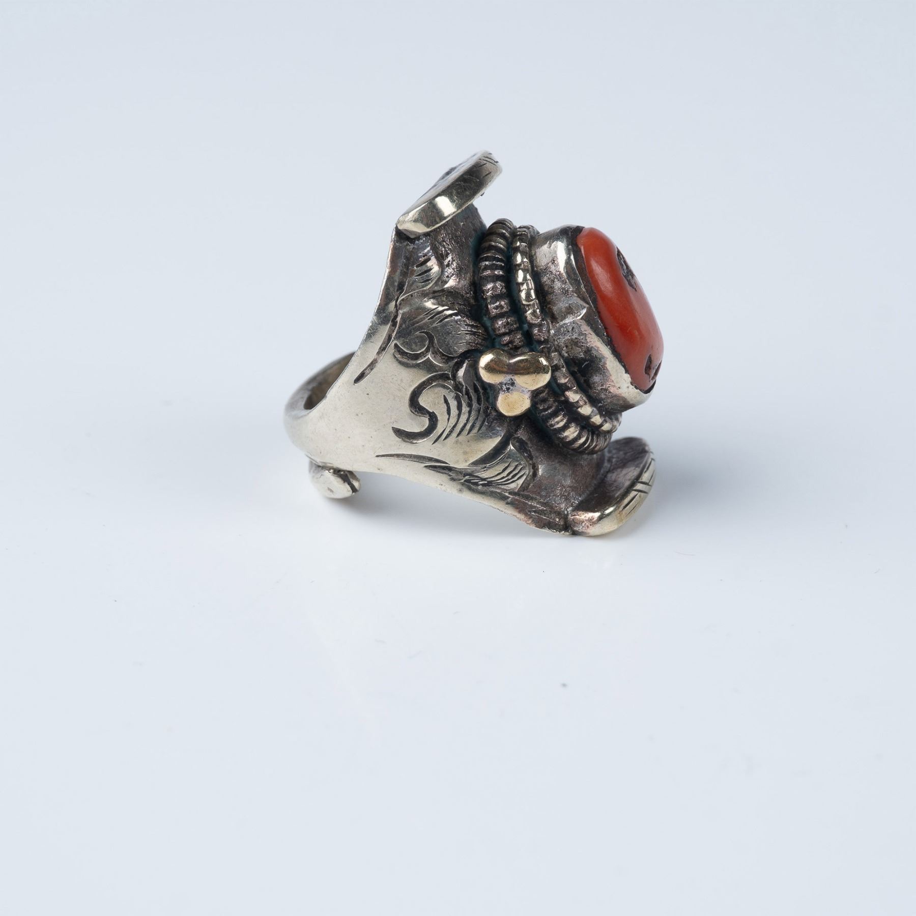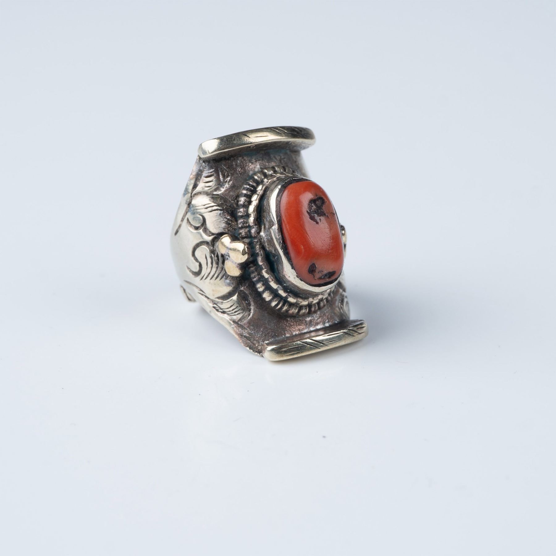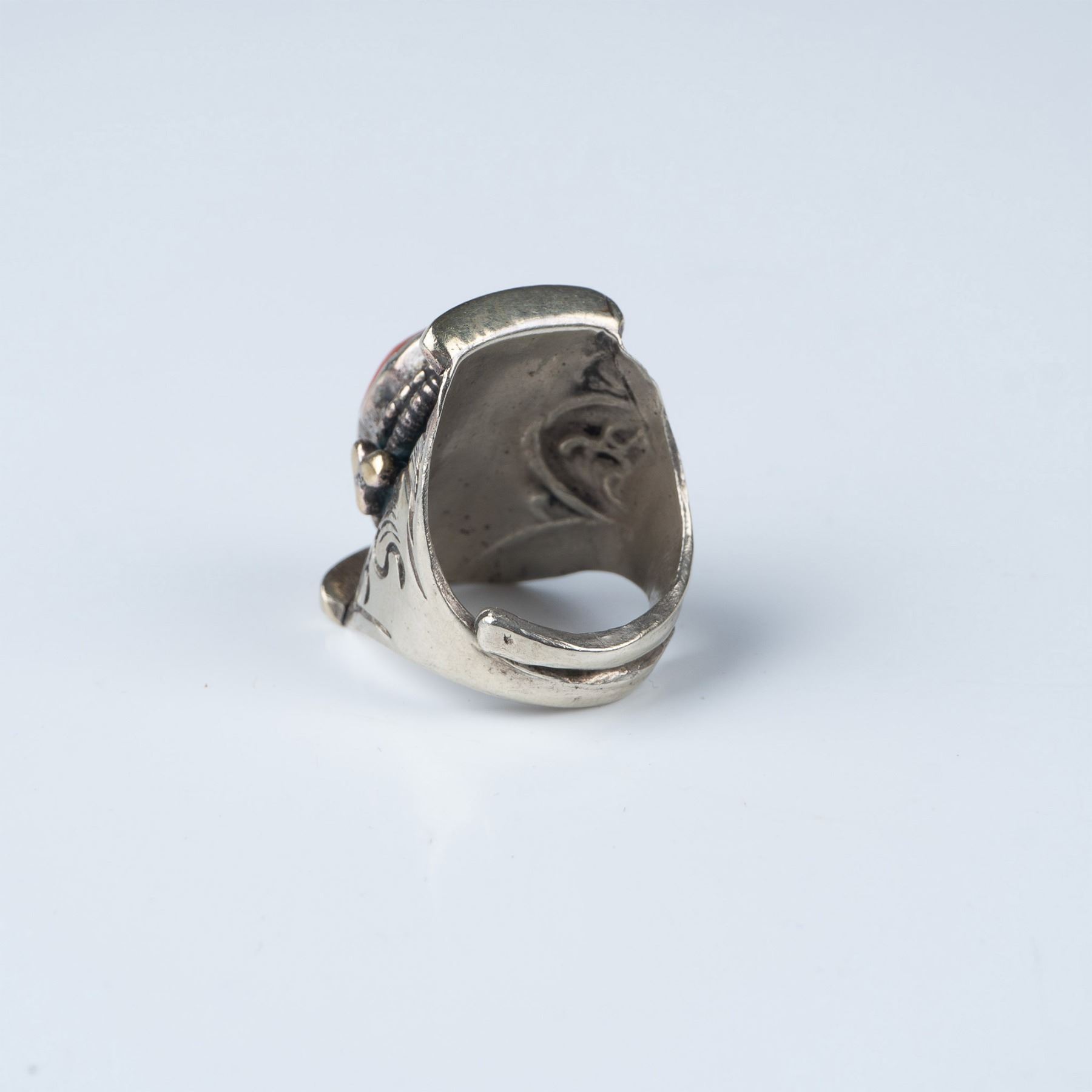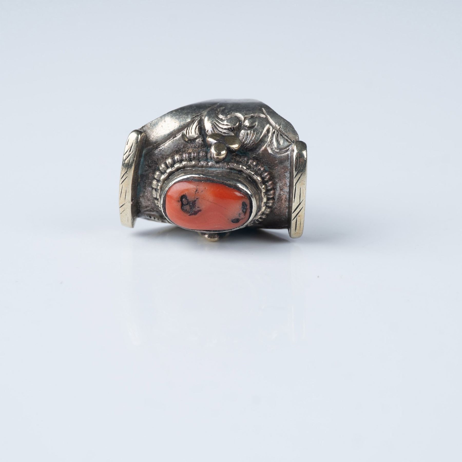 This bold silver-tone ring features an intricately designed band adorned with ornate floral engravings and an eye-catching coral-colored cabochon centerpiece. The oval stone, reminiscent of natural coral, adds a pop of warm reddish hue, framed by a textured and artistic setting. The wide, sculptural band enhances the piece's unique appeal, showcasing an artisanal flair that makes it a standout accessory. This striking statement piece is perfect for collectors of vintage-inspired jewelry or anyone looking for a unique addition to their wardrobe. Ring size is adjustable, currently estimated to be around a size 9.