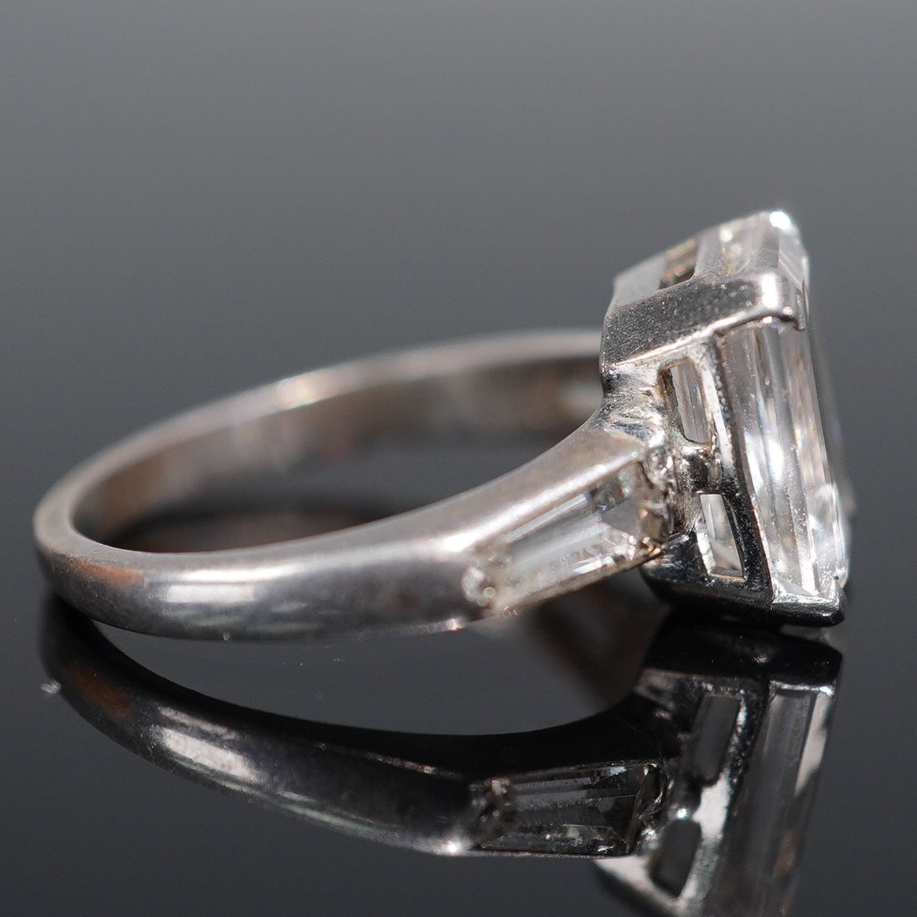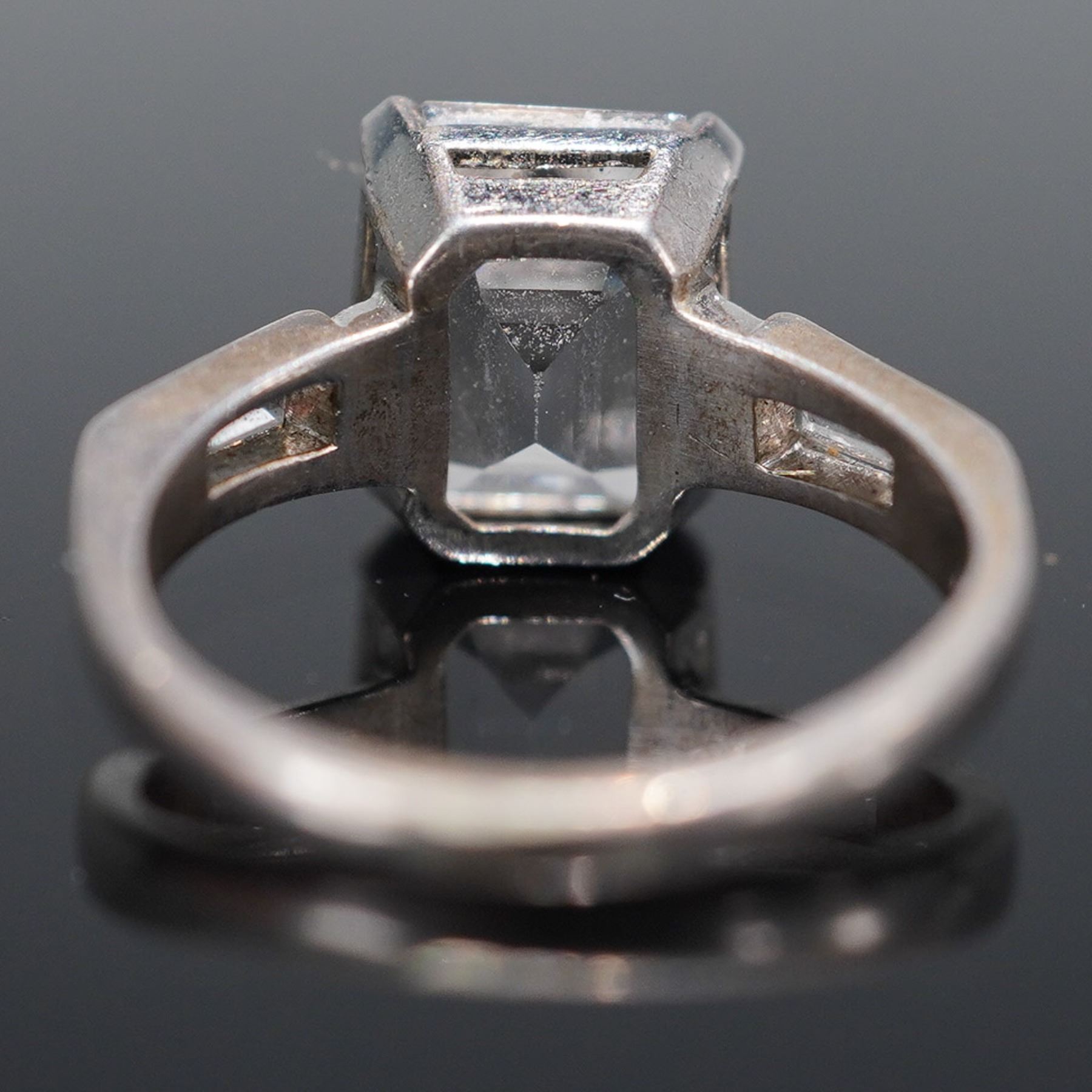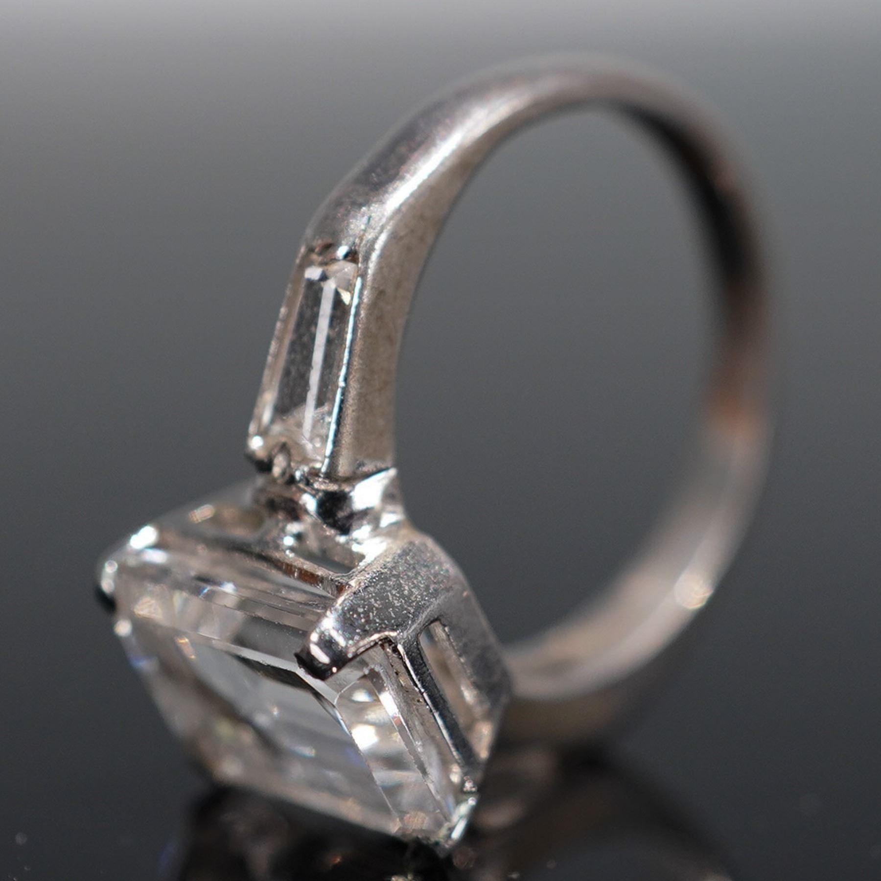A refined silver-tone fashion ring size 5, featuring a prominent emerald-cut clear cubic zirconia as its centerpiece, flanked by tapered baguette-cut zirconia stones on each side. The center stone is prong-set to enhance light reflection, with an elegant step-cut structure emulating the style of classic diamond solitaires. The side stones are inset into the band, offering a subtle touch of brilliance. The ring band is unmarked, and its setting and craftsmanship suggest it is a high-quality costume or fashion jewelry piece, ideal for stylish wear or theatrical use. An elegant and affordable alternative to fine jewelry, this ring offers timeless glamour with sparkling brilliance.