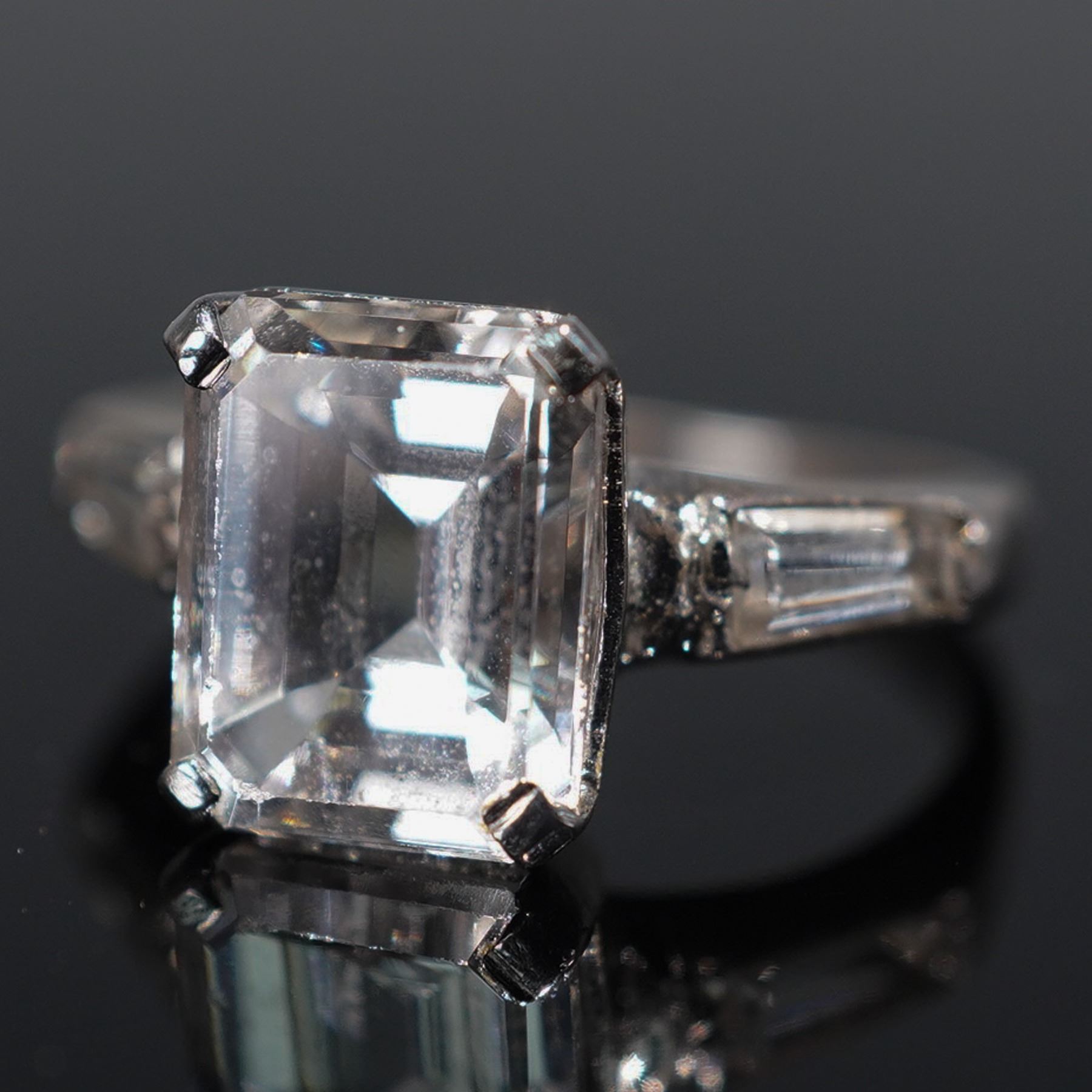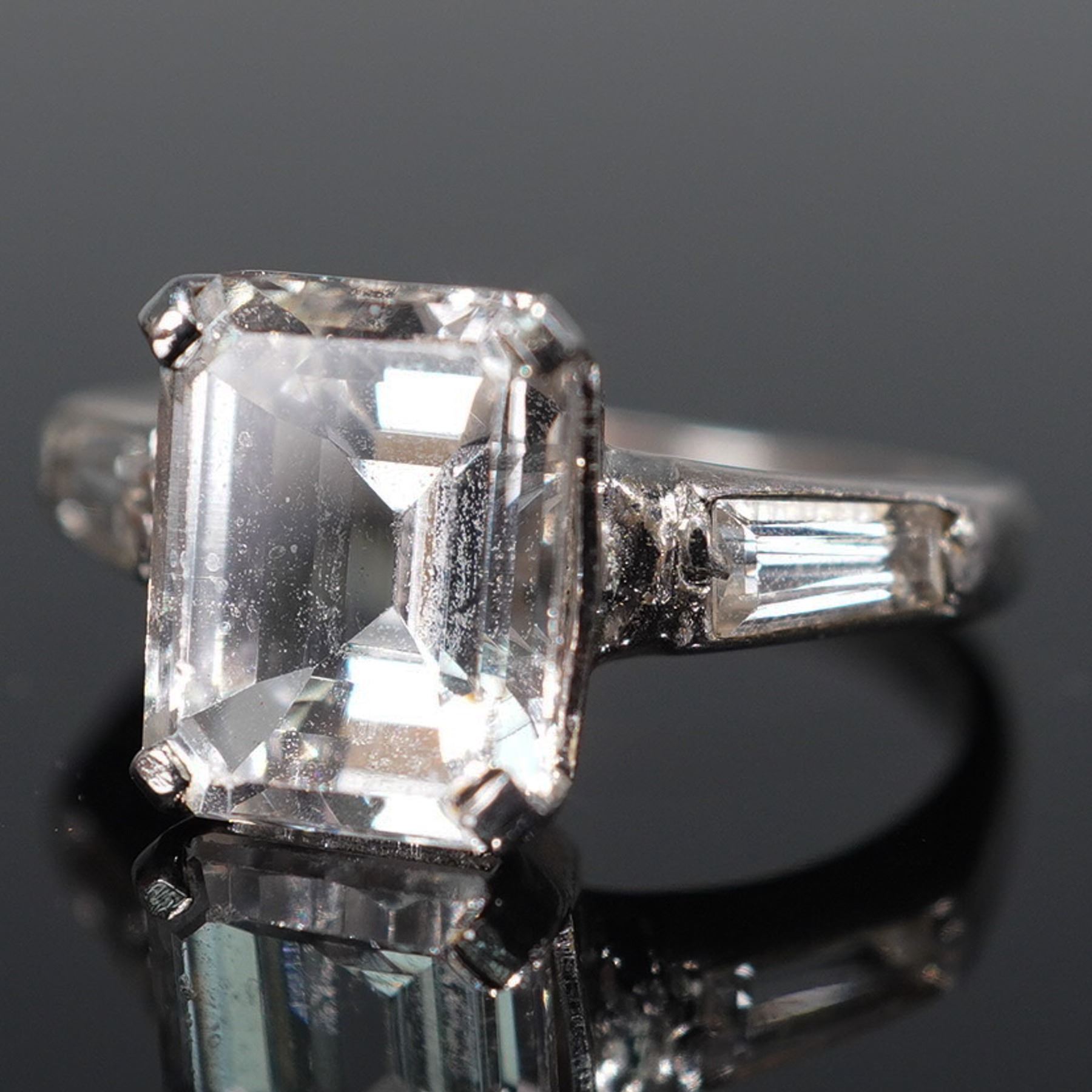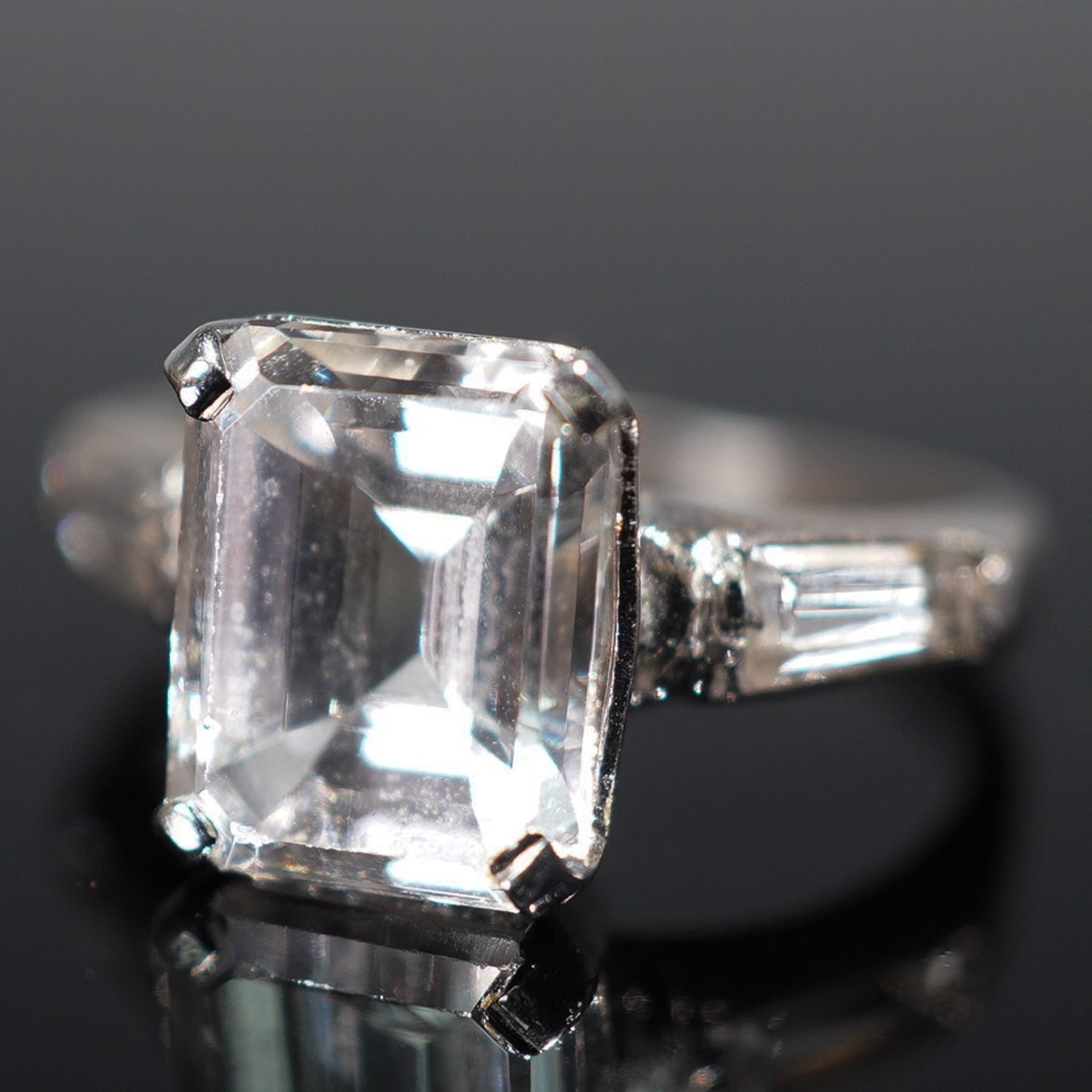 A refined silver-tone fashion ring size 5, featuring a prominent emerald-cut clear cubic zirconia as its centerpiece, flanked by tapered baguette-cut zirconia stones on each side. The center stone is prong-set to enhance light reflection, with an elegant step-cut structure emulating the style of classic diamond solitaires. The side stones are inset into the band, offering a subtle touch of brilliance. The ring band is unmarked, and its setting and craftsmanship suggest it is a high-quality costume or fashion jewelry piece, ideal for stylish wear or theatrical use. An elegant and affordable alternative to fine jewelry, this ring offers timeless glamour with sparkling brilliance.