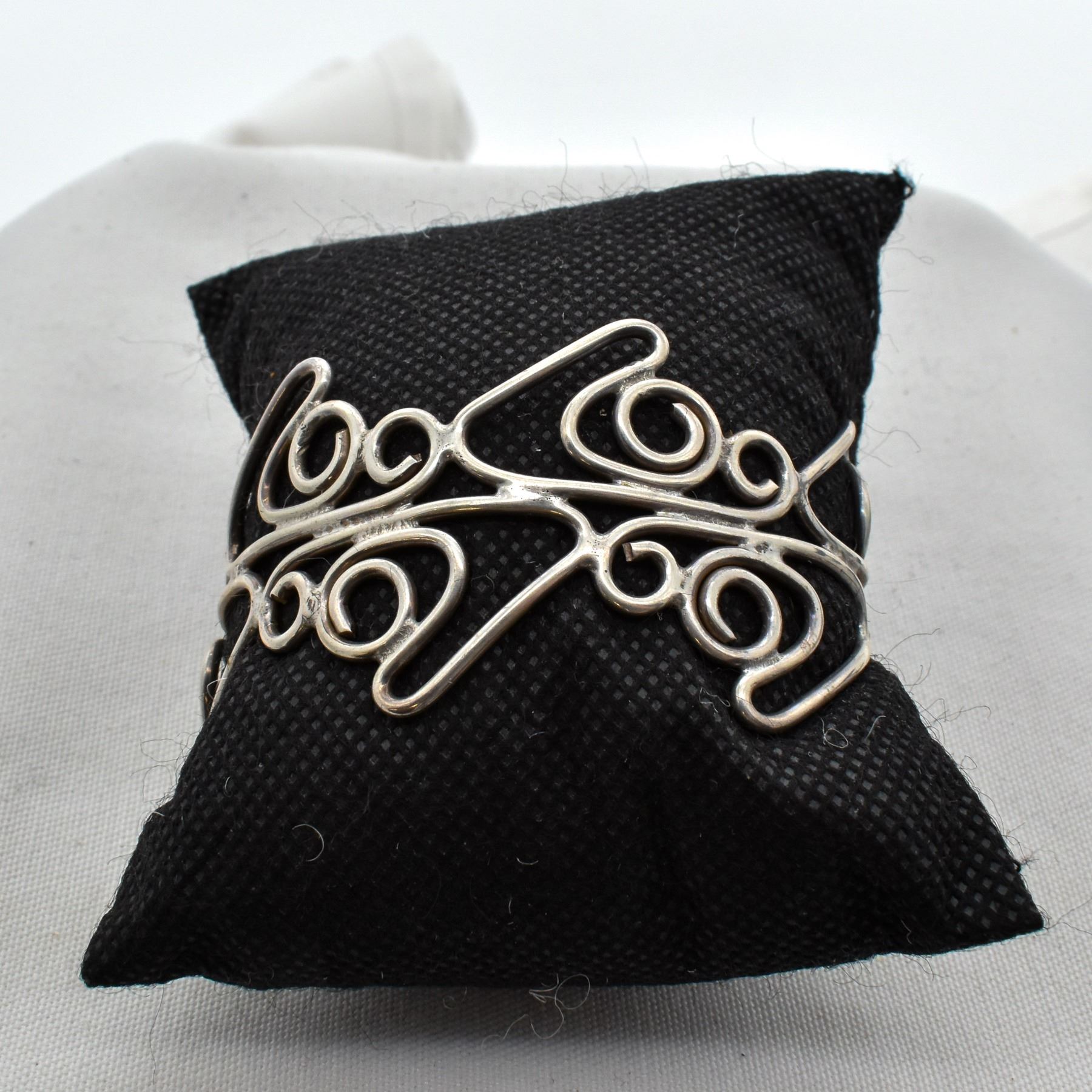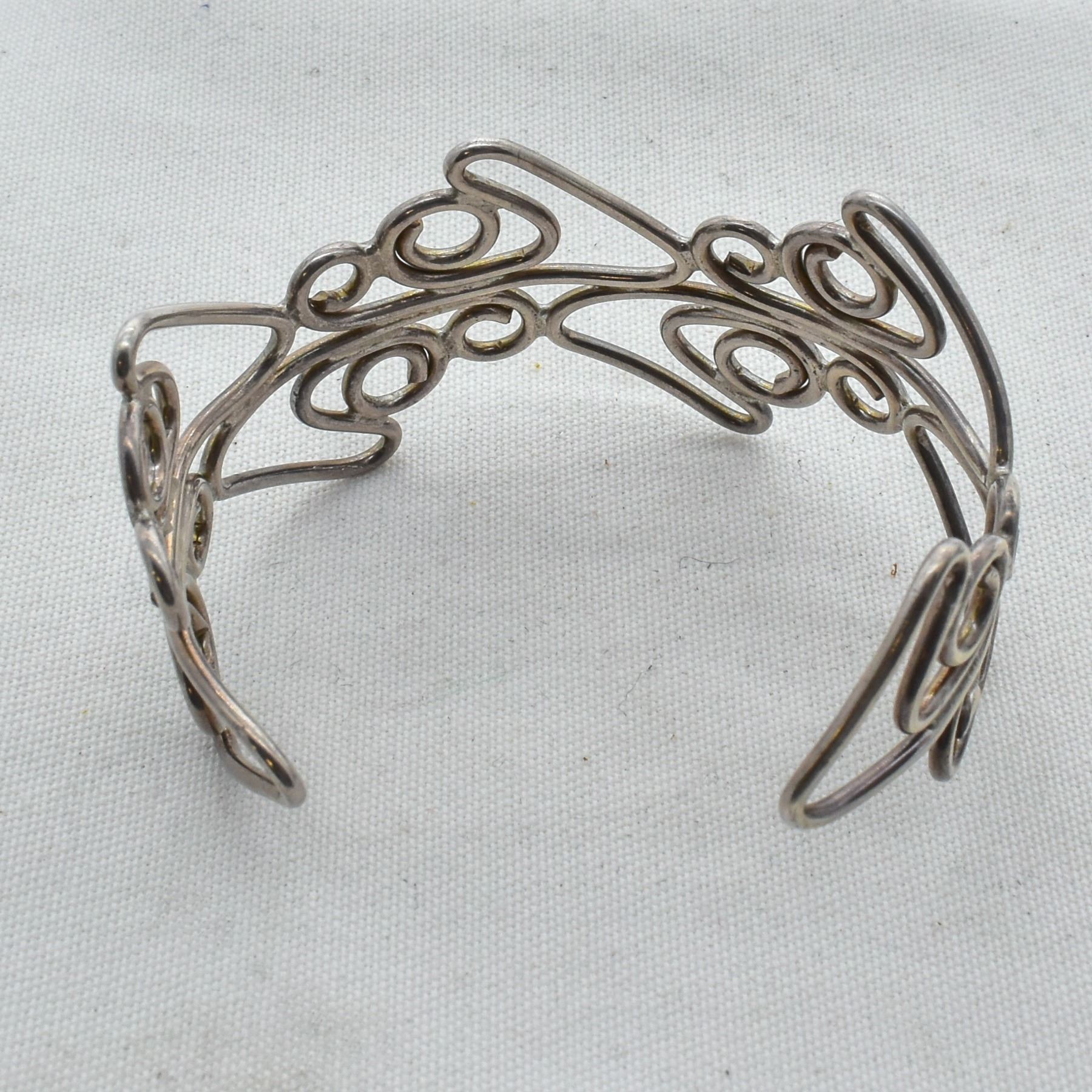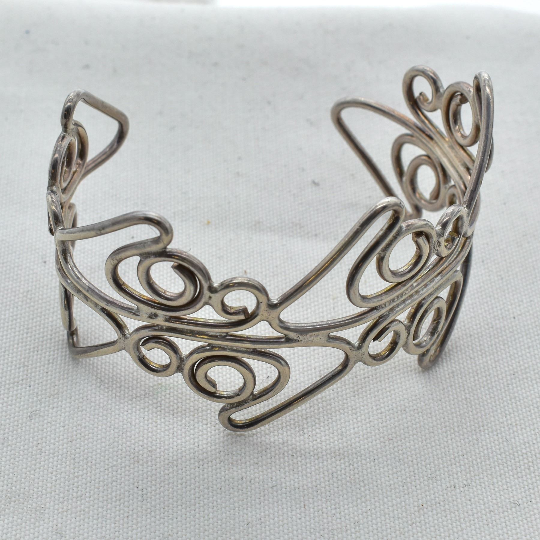 Silver Tone Scrollwork Cuff Bracelet, inside measures 6'' which includes the gap x 1.5''W